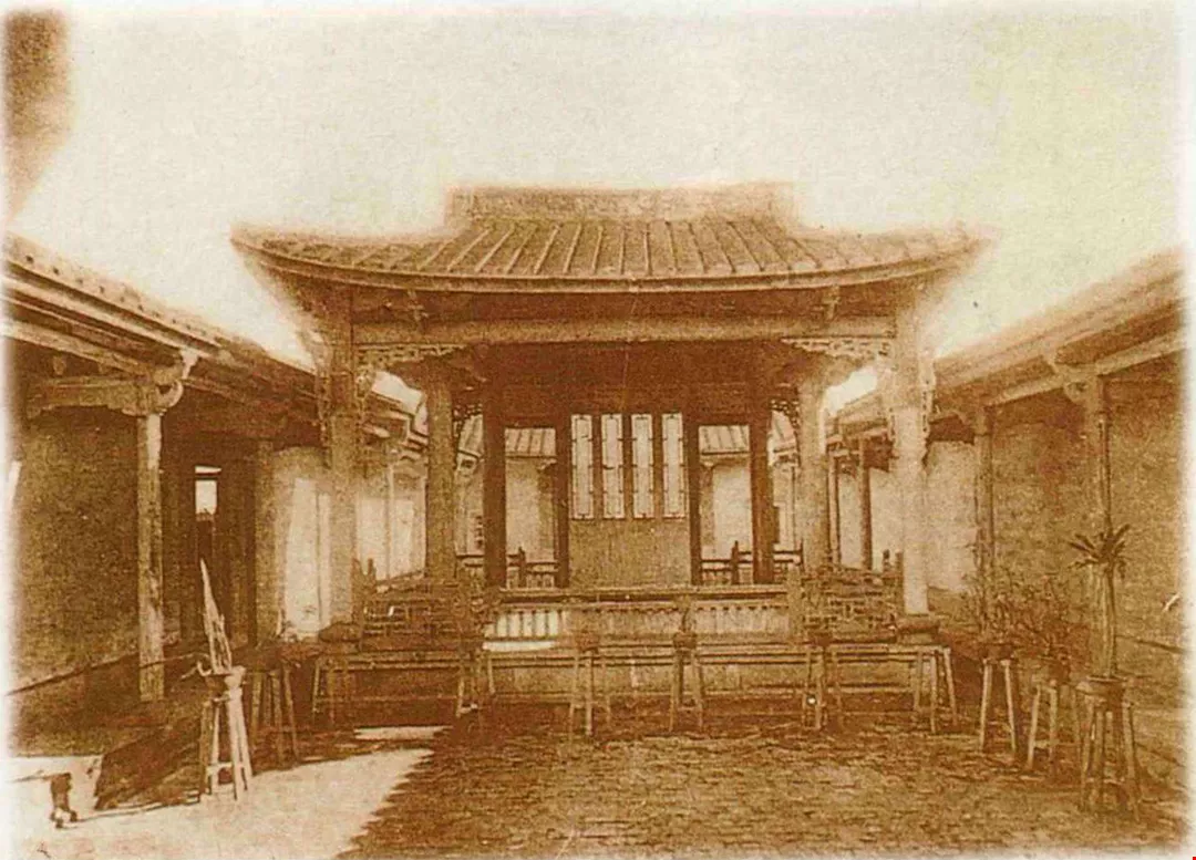 The White Flower Room in the Lin Family Garden in Panchiao was where the family received guests. In the center is a theatrical stage. The room is so named because it is painted white and decorated with plants. The work of building the Garden was put in hand in 1888 by Lin Wei-yuan, brother of Lin Heng-tao's great-grandfather. (courtesy of Wang Kuo-fan)