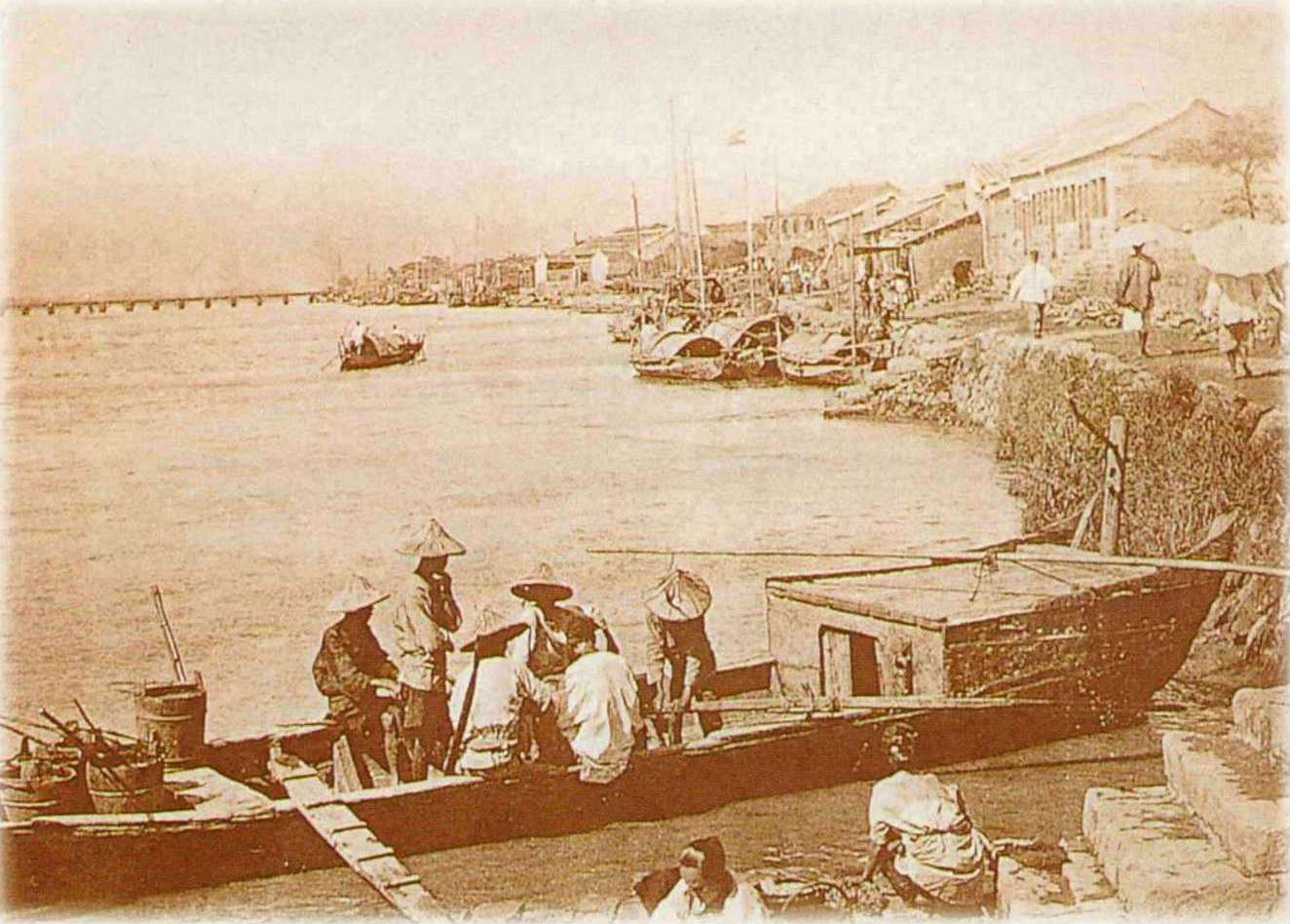 Tataocheng,by the Tanshui River.Taipei Bridge is in the left background. In the 10th year of the Qing dynasty Xianfeng reign(1860),when this photograph was taken,Tataocheng was a trading port, and the river bank was lined with foreign trading houses. Close by was the consulate area. (from A Glimpse of Historical Taiwan)