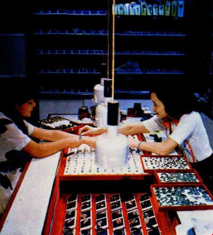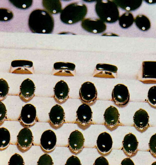 1 & 2. Ring and bracelets incorporating Taiwan jade are popular. 3. & 6. The exquisite cat's eye stones. 4. Jade can also be made into artifacts. This jade incense-burner is typically Chinese. 5. Yang Tzu-hung, who produced Taiwan's first cat's eye stone, says local gems have a wider variety of colors than those from Ceylon.