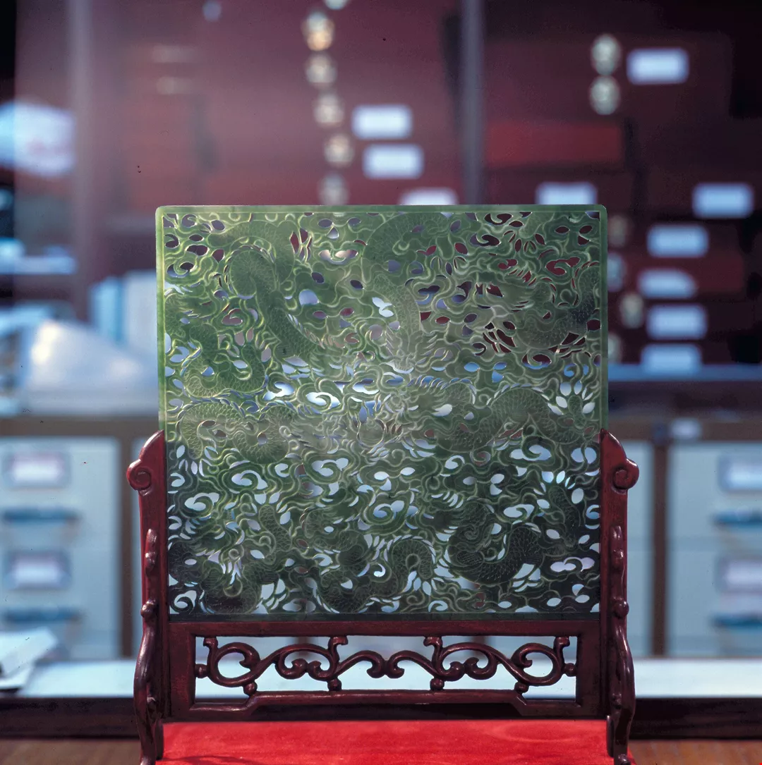 This sculpted jade screen features several dragons, a symbol of good fortune in China.