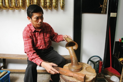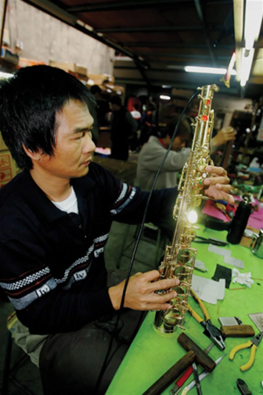 When the assembly stage is complete, the craftsman will insert a small "leak light" into the body of the horn, to see if there are any leaks around any of the tone holes. In the past, before leak-light testing was invented, craftsmen would blow cigarette smoke into the horn; it took about two packs to test each horn. "We didn't need any excuse to smoke back then," recalls 74-year-old Master Chang Lai with a laugh. He jokes, but the dedication required of instrument makers is plainly no laughing matter.