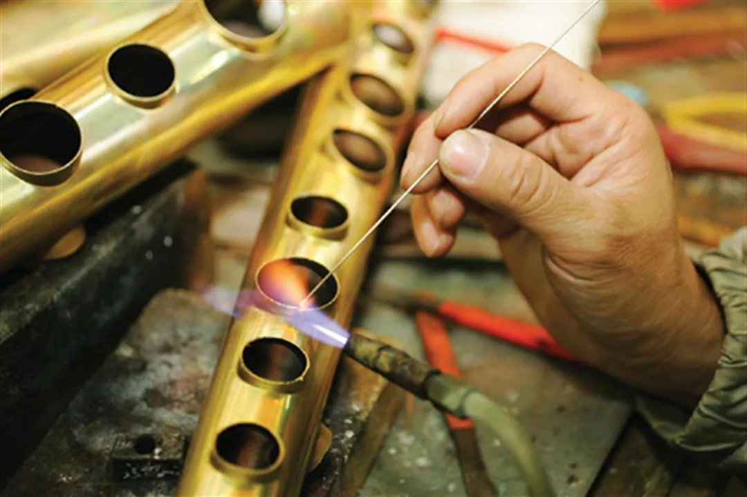 After finishing, an "acid bath" is used to wash away any impurities and solder remaining on the surface. If the soldering was not done sufficiently tightly, leaving tiny cracks or gaps, the acidic solution will seep into the crevices, and in the future will slowly penetrate into and damage the luster of the instrument. This is why the soldering process, which looks so simple at first, in fact is very demanding, because it has to be flawless.