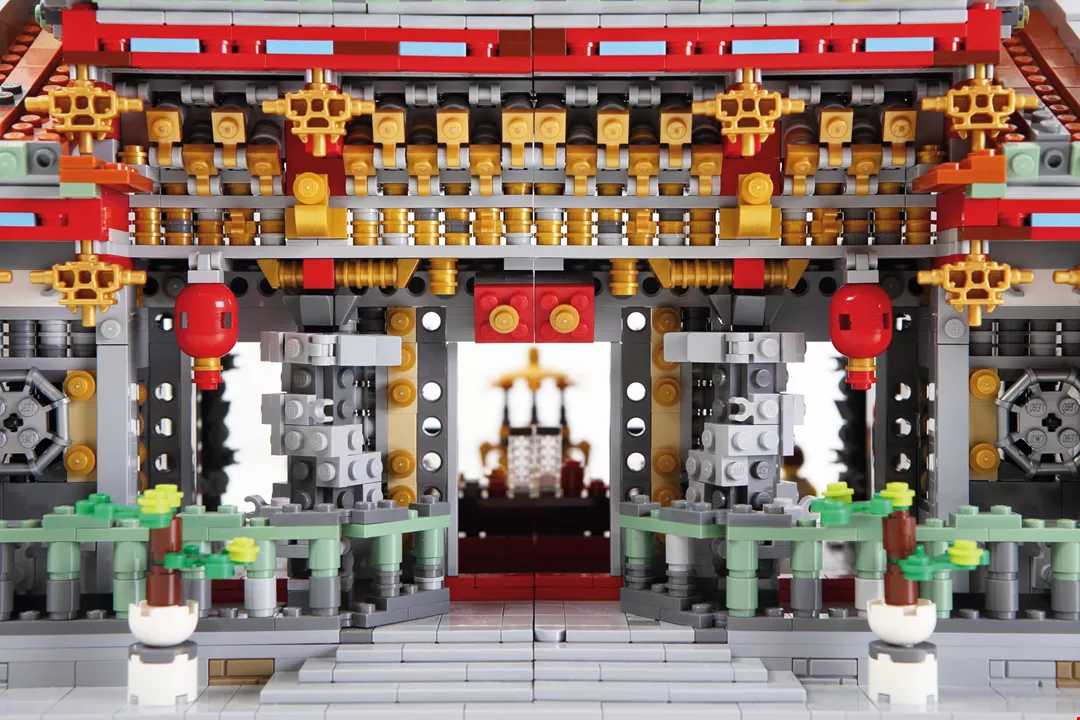 Chen first installed pieces around the edges of a baseplate to trace out the periphery of the temple premises before determining the precise dimensions of the temple pavilions. The height of his structures was set at a specific ratio to the height of the human figures.
