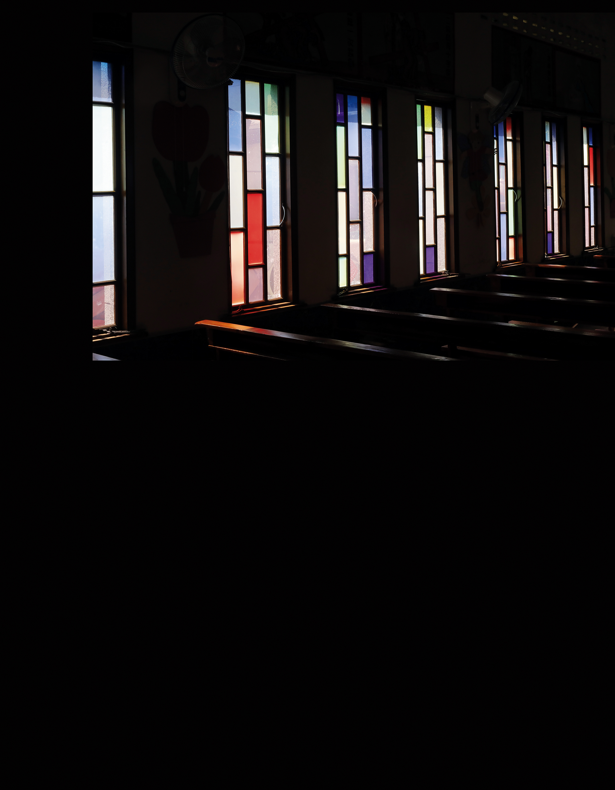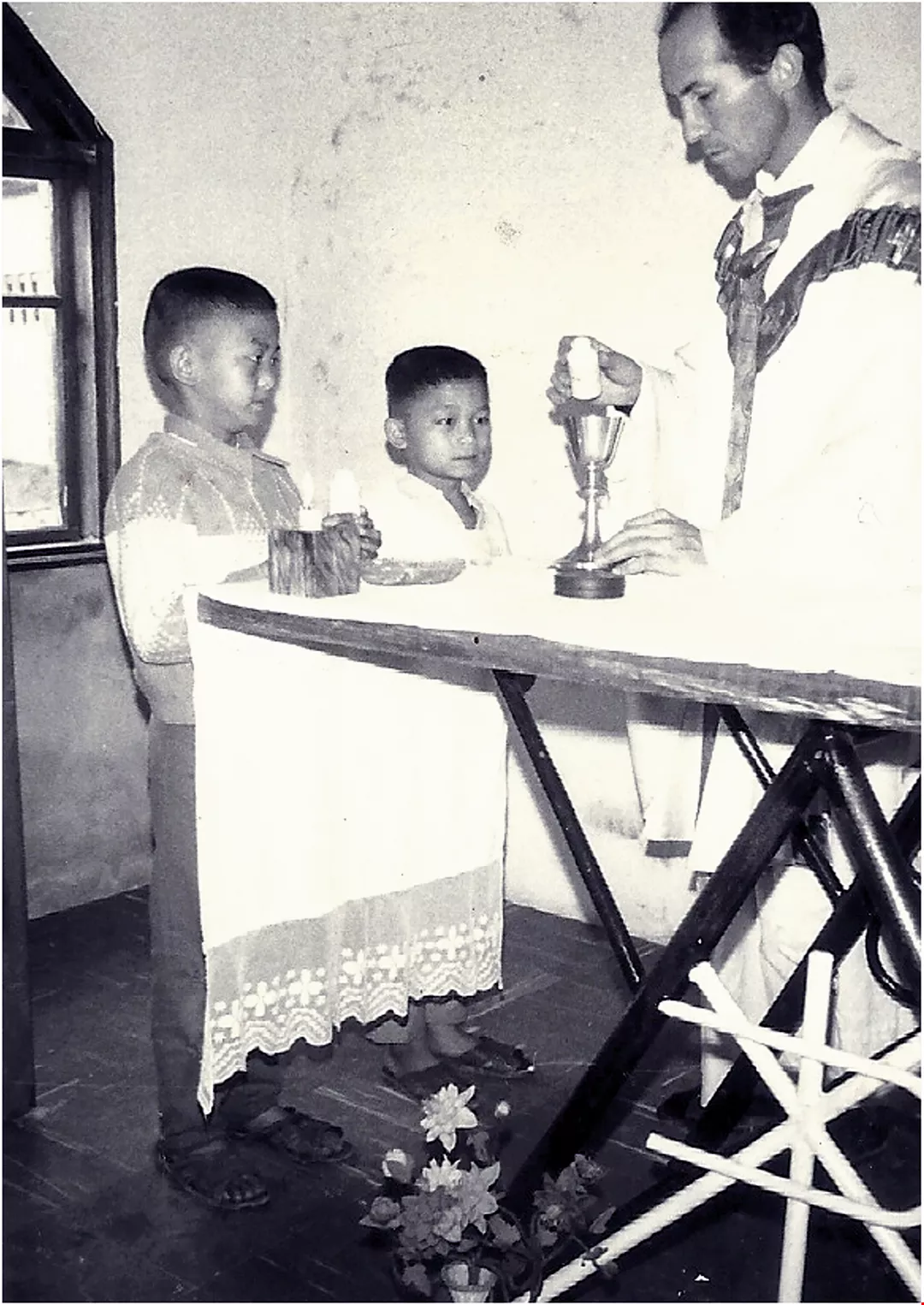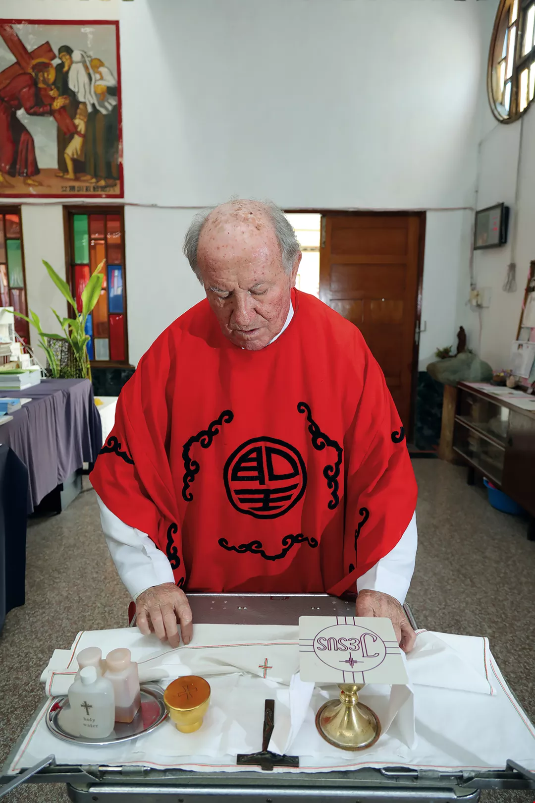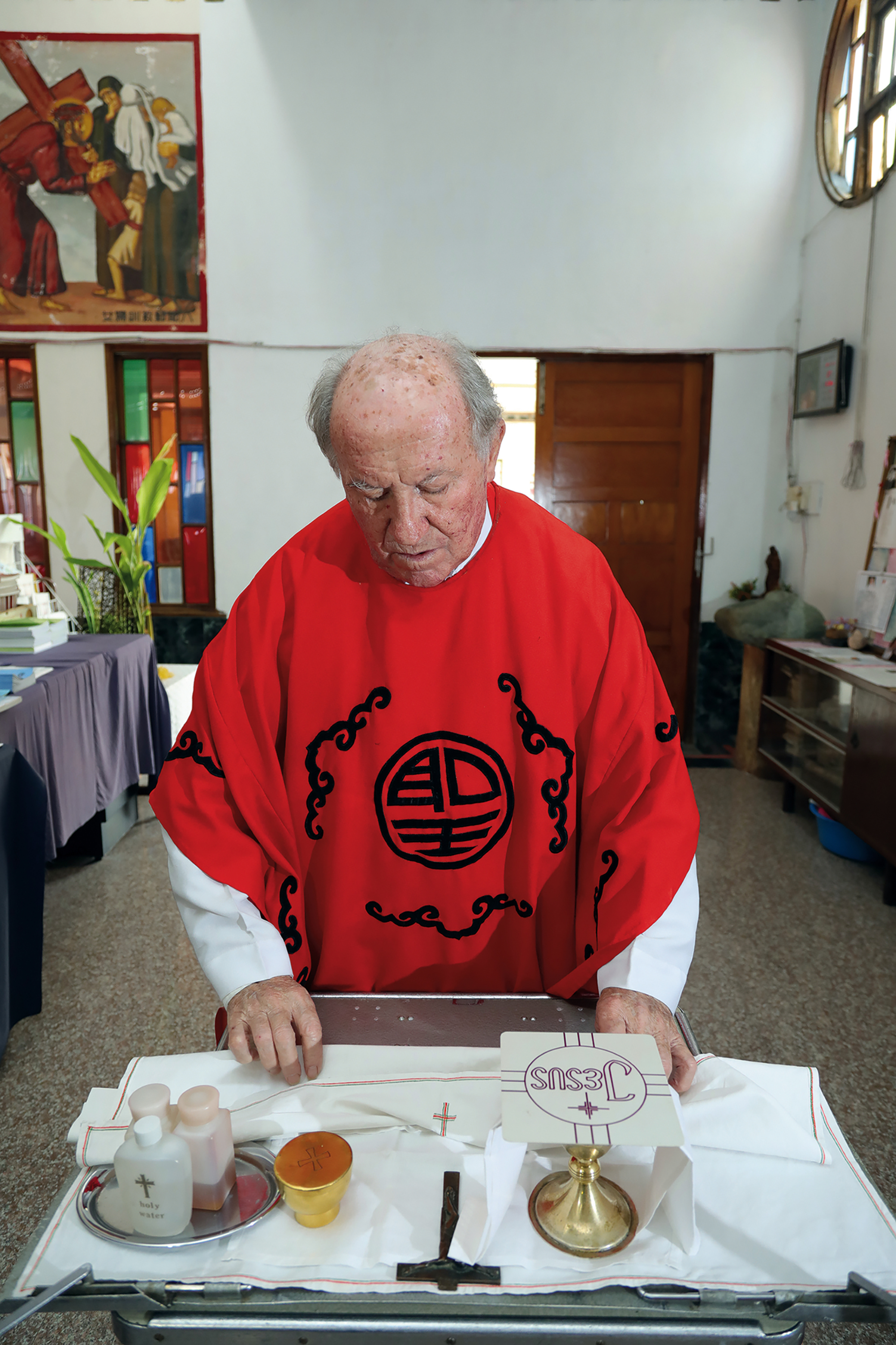 As we visit Fournier’s rooms on the day of our interview, although there is not much space, the vestiges of a lifetime’s missionary work, keepsakes, old photos, old radios, and so on are spread throughout the study, already quite small enough. As we enter the bedroom, apart from the narrow single bed, at the side we see a small washroom and toilet. Frankly, the space is cramped, but he endures hardship gladly. We listen to church members beside us discussing the priest’s belt and how, for decades, kept repairing it rather than buy a new one. Also, many of the tables and chairs in the church are recycled.