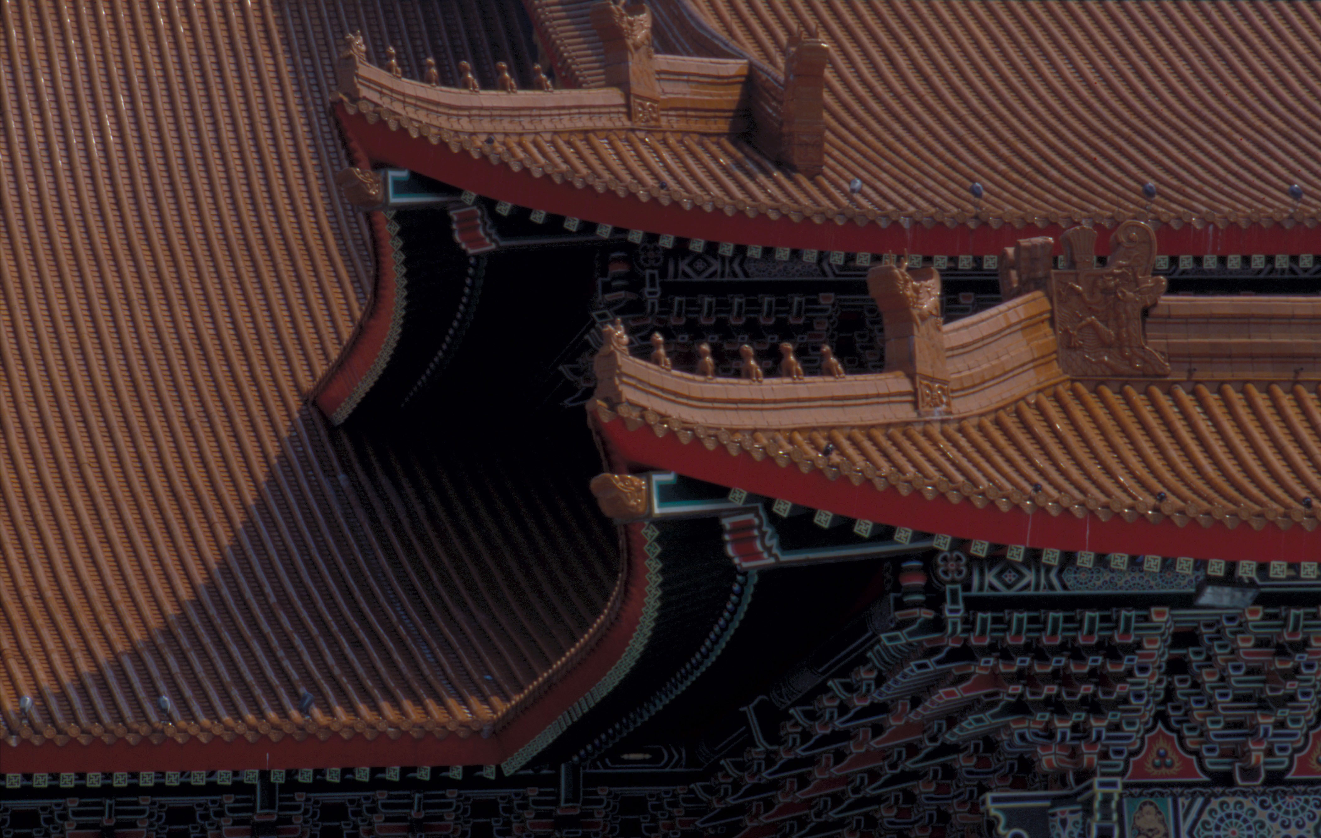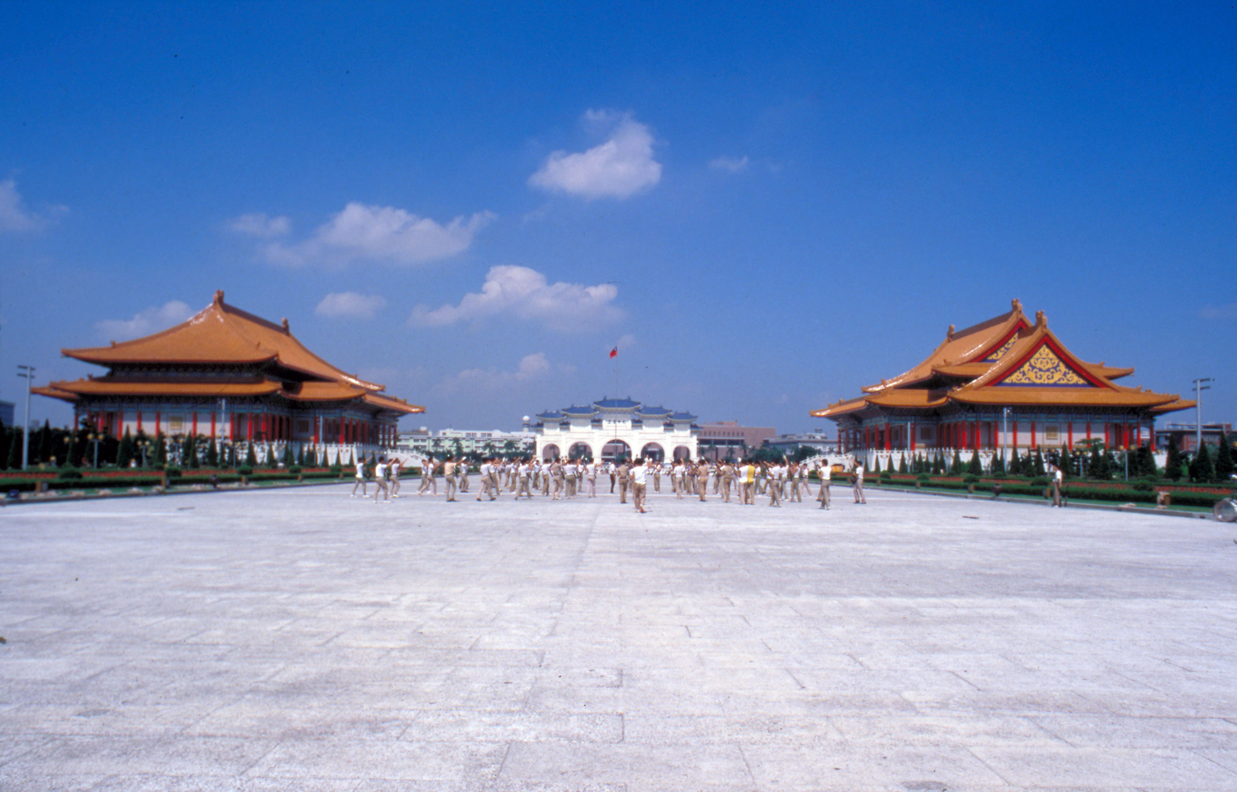 These two structures, costing a colossal NT$7.4 billion, are situated in the Chiang Kai-shek Memorial Hall complex. They are fashioned after the traditional palace style, with red columns and yellow tiled roofs complemented by a white wall with blue tiles at the top.