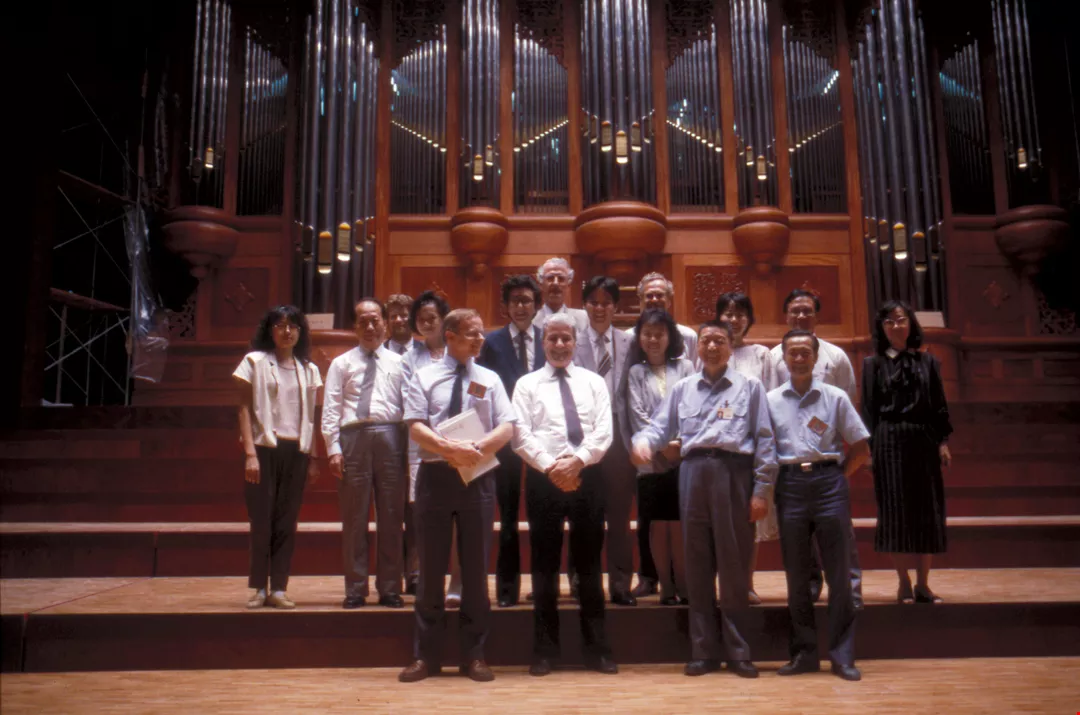 Employees of Sinotech Engineering Consultants and the Ho Mu Construction Firm, two companies which worked on the halls, some experts from Germany and Holland and some reporters posed in front of the giant organ for a group photo. (photo by Chiu Sheng-wang)