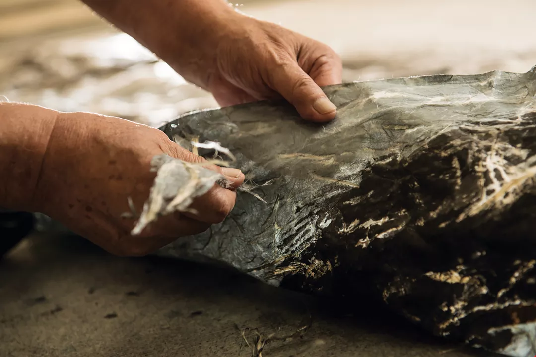 But tearing the fibers from the paper is a lot of work, and Liu often asks Li Mo-hua, his “number-one assistant,” to help out. She usually does so after Liu has gone to sleep, squatting on the floor, using her fingernails to feel for raised spots on the paper, and then slowly pulling off the fibers. “I’ve pulled off so many that my knuckles have become deformed,” she says, showing Liu the twisted fingers of her right hand.