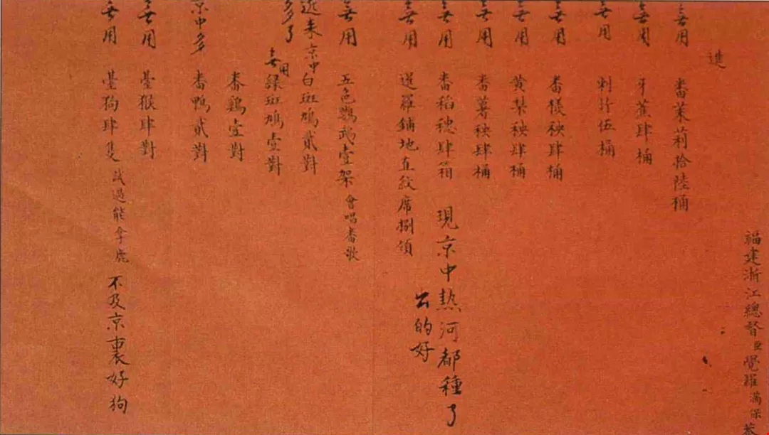 Professor Chen Chieh-hsien, an expert on Qing dynasty history, says that the governors of every province would frequently send local products to Beijing in hopes of currying favor with the emperor. But Kangxi and Yongzheng believed the practice was a waste of money and manpower and didn't encourage it, belittling it in the margins of imperial reports and statements of accounts.