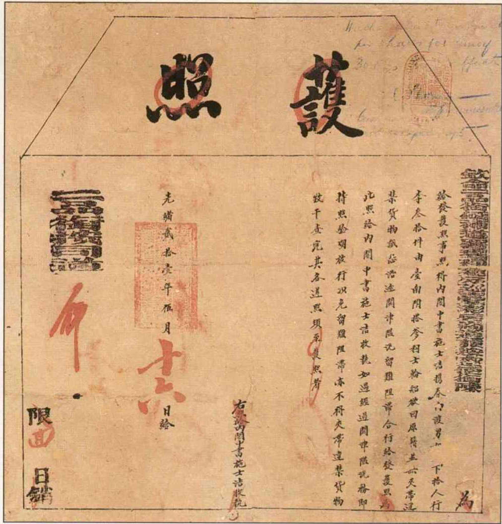 During the rule of Guangxu, Taiwan County issued family passports. This passports contains 10 names and 30 pieces of luggage and notes that its bearers are carrying no prohibited goods. During the Qing dynasty, the government wavered between strict and loose policies regarding those mainlanders who wanted to cross the strait to Taiwan. (courtesy of National Museum of History)