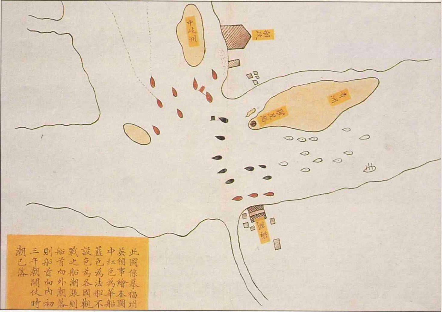 It turns out that the Qing forces were put at a great disadvantage because of the tide. In this illustration, the Chinese and French forces are represented by little tadpole shapes colored red and blue respectively. In the illustration the Qing ships resemble the pincers of a pair of tongs protecting the Min River, and in the middle are French ships facing the cannons of Luoxingta. In theory, it seems that the Qing forces shouldn't have lost.