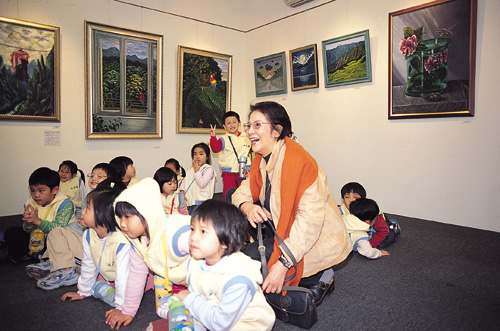 Formerly the director of the Mandarin Daily News, Madame Wei-wei has long been dedicated to children's education. Here she accompanies a group of children at her art exhibition.