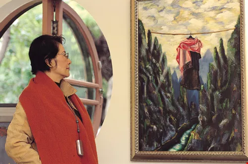 For example, her painting A Tribute to Frida Kahlo features a woman's outfit draped with a shawl, suspended by a clothes hanger over a gaping chasm, as a way of paying her regards to the modern Mexican painter whose tragic life was depicted in the film Frida. Hsi Sung says that great women painters have always been extremely rare, so Frida Kahlo's artwork, which gives vivid expression to a woman's passion, makes a strong and distinct impression. It's no wonder, then, that when Mme. Wei-wei threw herself into painting, Kahlo became her favorite painter, an admiration which perhaps reveals another side to Mme. Wei-wei's mild character.