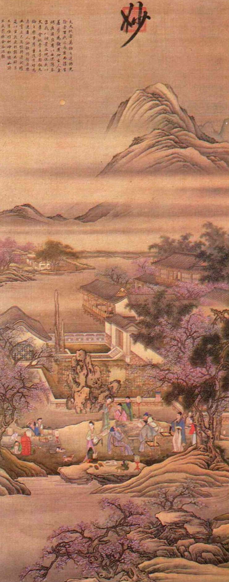 This painting is one of the best examples of the art-from-literature school of painting. Leng Mei's inspiration for this work was a short essay written by the immortalized T'ang poet Li Po (701-762 A.D.). In this short essay, Li Po captures the beauty and joy of a spring evening spent with friends. In just over a hundred characters Li describes a merry world of wine and song, and sets a tone of underlying sadness with imagery of spring's brief tenure.