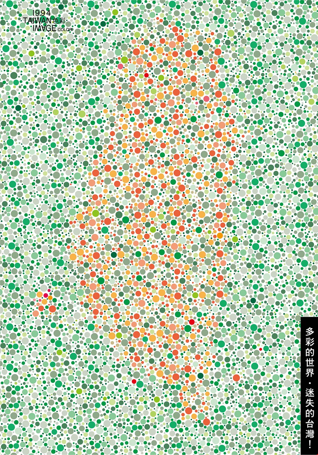 Lin’s The Colorful World, the Stray Taiwan (1996) is inspired by the Ishihara test, which helps detect red–green deficiencies in color vision. Using colorful dots to accentuate the shape of Taiwan, the poster looks plain but furnishes a trenchant satire of those who get lost in superficial impressions and turn a blind eye to Taiwan’s actual predicament. The Colorful World, the Beautiful Taiwan (2005), on the other hand, shows the island emerging mistily from countless colorful bands. These vertical neon streaks conjuring Taiwan’s silhouette symbolize Taiwan’s achievements in computer technology and in the cultural and creative industries, demonstrating to the world the island’s value and beauty. The contrast between the two posters reflects the artist’s evolving meditations on Taiwan.