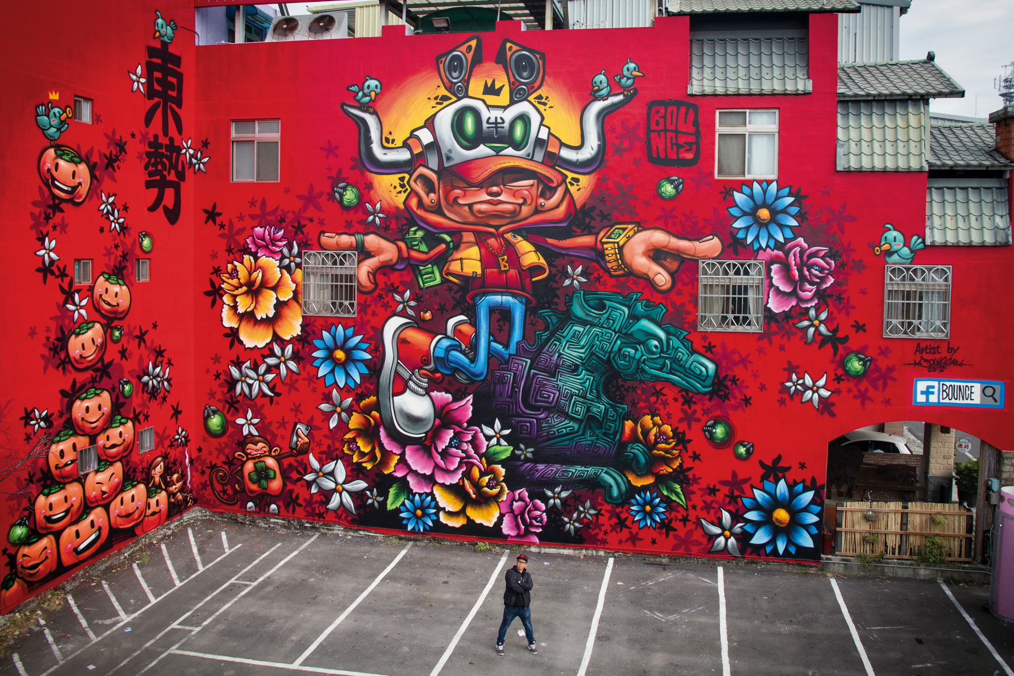 At the invitation of the General Association of Chinese Culture, Bounce painted a graffiti mural on the wall of their premises on Taipei’s Chongqing South Road. (courtesy of BOUNCE)
