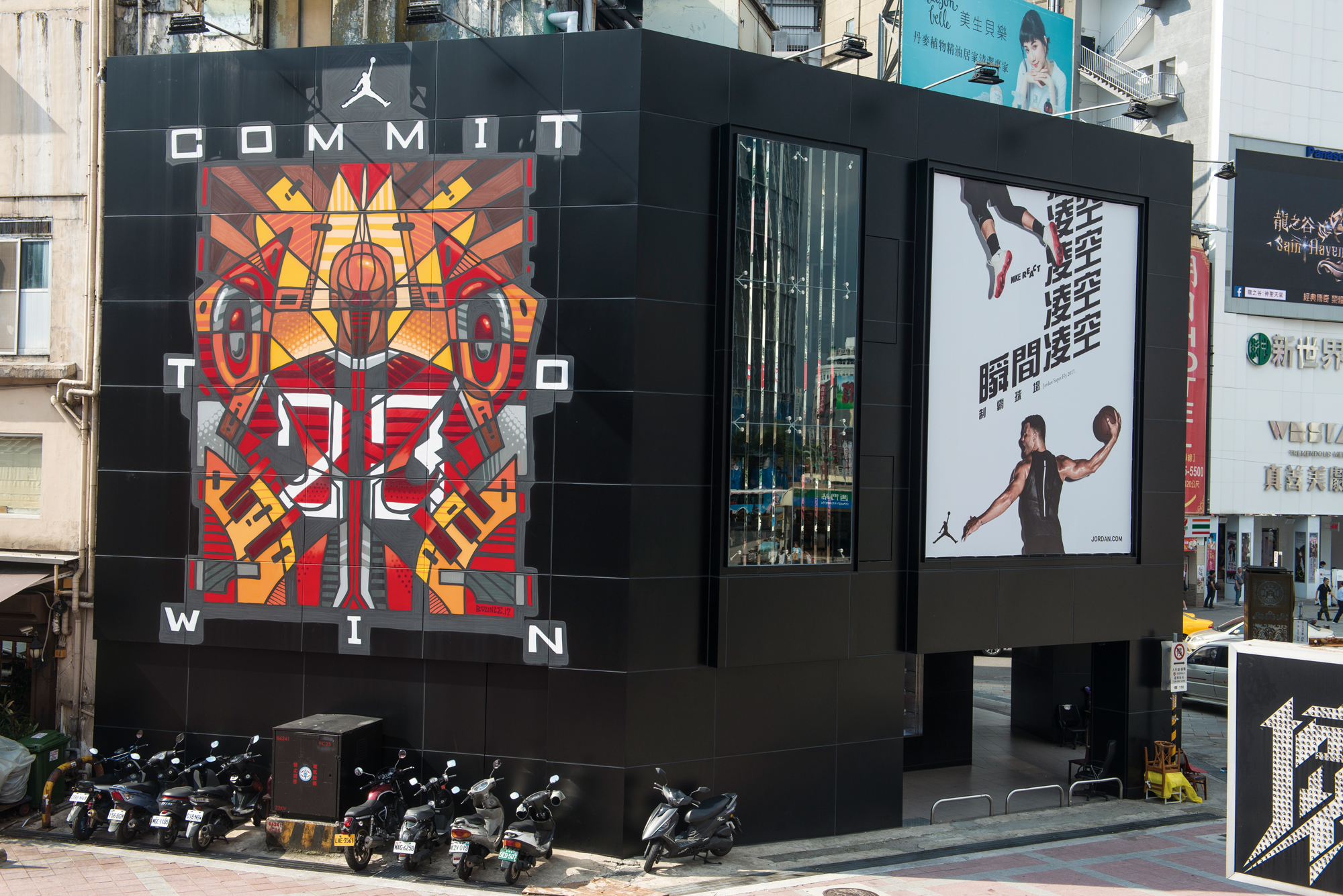 This outlet for a well-known sportswear brand, near to Ximending’s Red House, boasts a cool, vibrant mural in which Bounce made use of bold colors and geometric shapes to create a tribute to Michael Jordan.