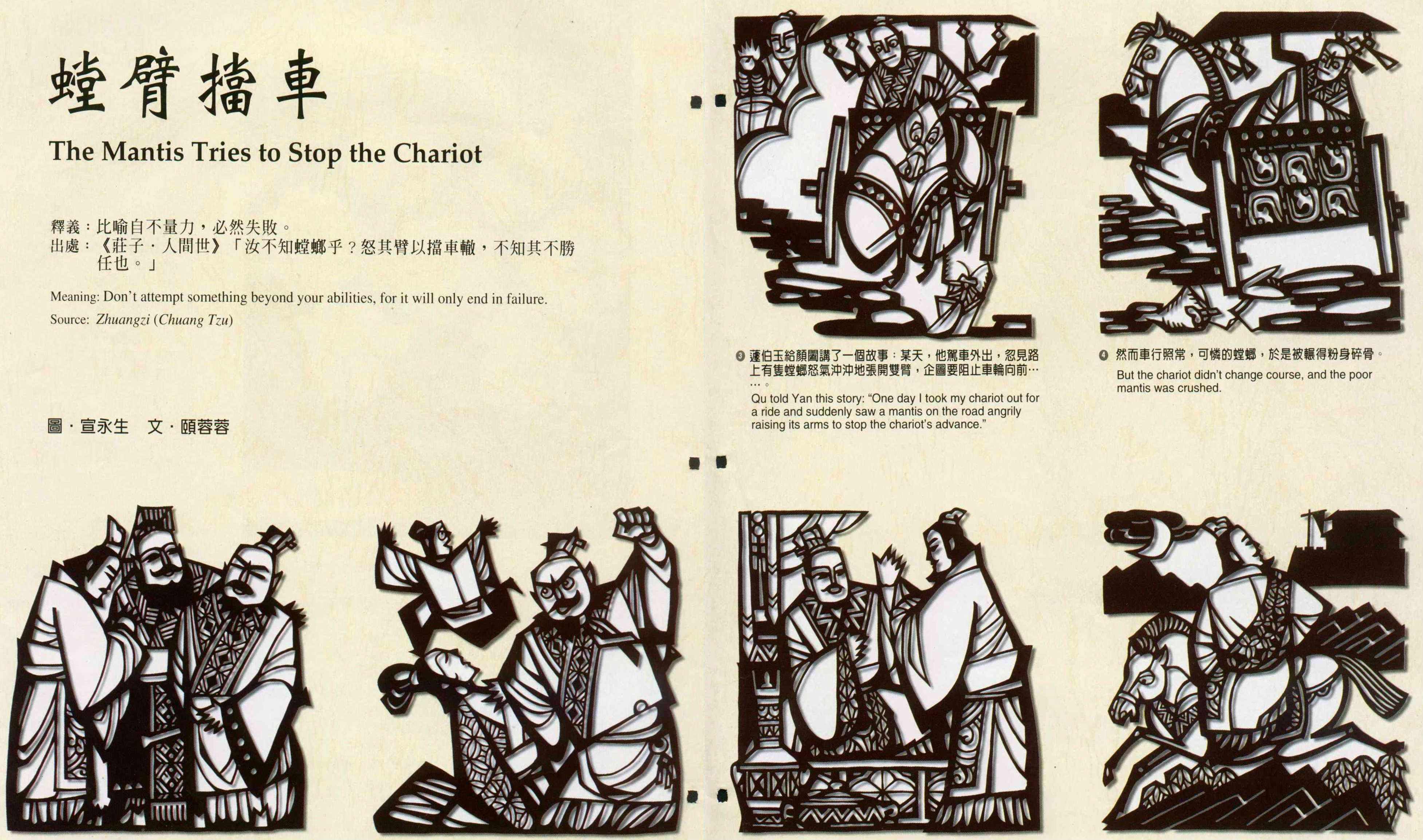 3.Qu told Yan this story: "One day I took my chariot out for a ride and suddenly saw a mantis on the road angrily raising its arms to stop the chariot's advance."