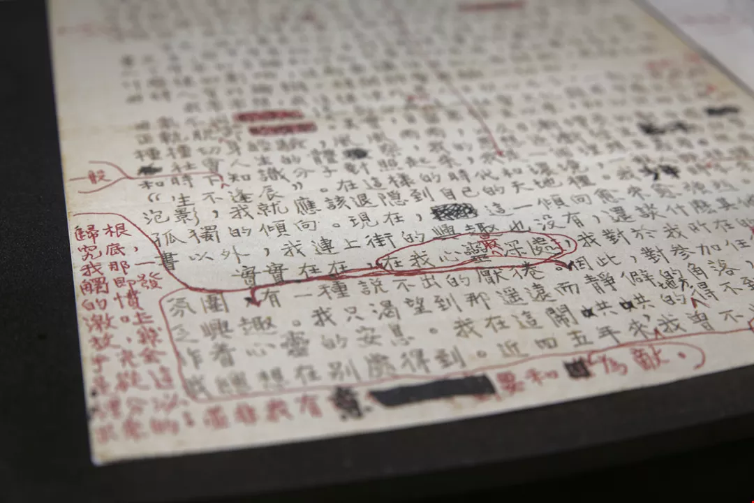 In one black-and-white photograph, Yin, wearing an undershirt with a shovel in hand, is building the paddling pool for his newborn daughter. Another is of Yin and his wife Hsia Chun-lu on their wedding day. On the other side of the room is a display of Yin’s manuscripts. Besides his letter of appointment from National Taiwan University, one can see a draft of a letter to the traditional scholar Chien Mu. The draft, smaller than an A4-size sheet of paper, is replete with red, black and blue edits, exemplifying Yin’s serious, rigorous personality.