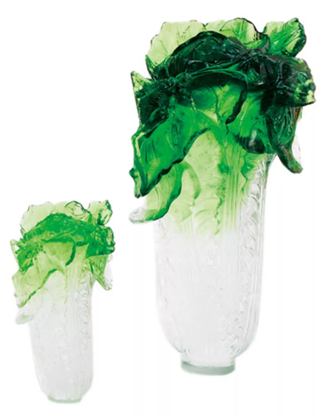 After that, he takes clear crystal, cuts it into thin slabs about the size of a cell phone, places them over the mouth of the mold, and places the mold into a kiln for firing. The clear crystal turns to liquid during firing and seeps into the center of the casting, where it fuses with the green liquid, yielding a gradual progression of color in the cabbage stalks, from light green to perfectly clear.