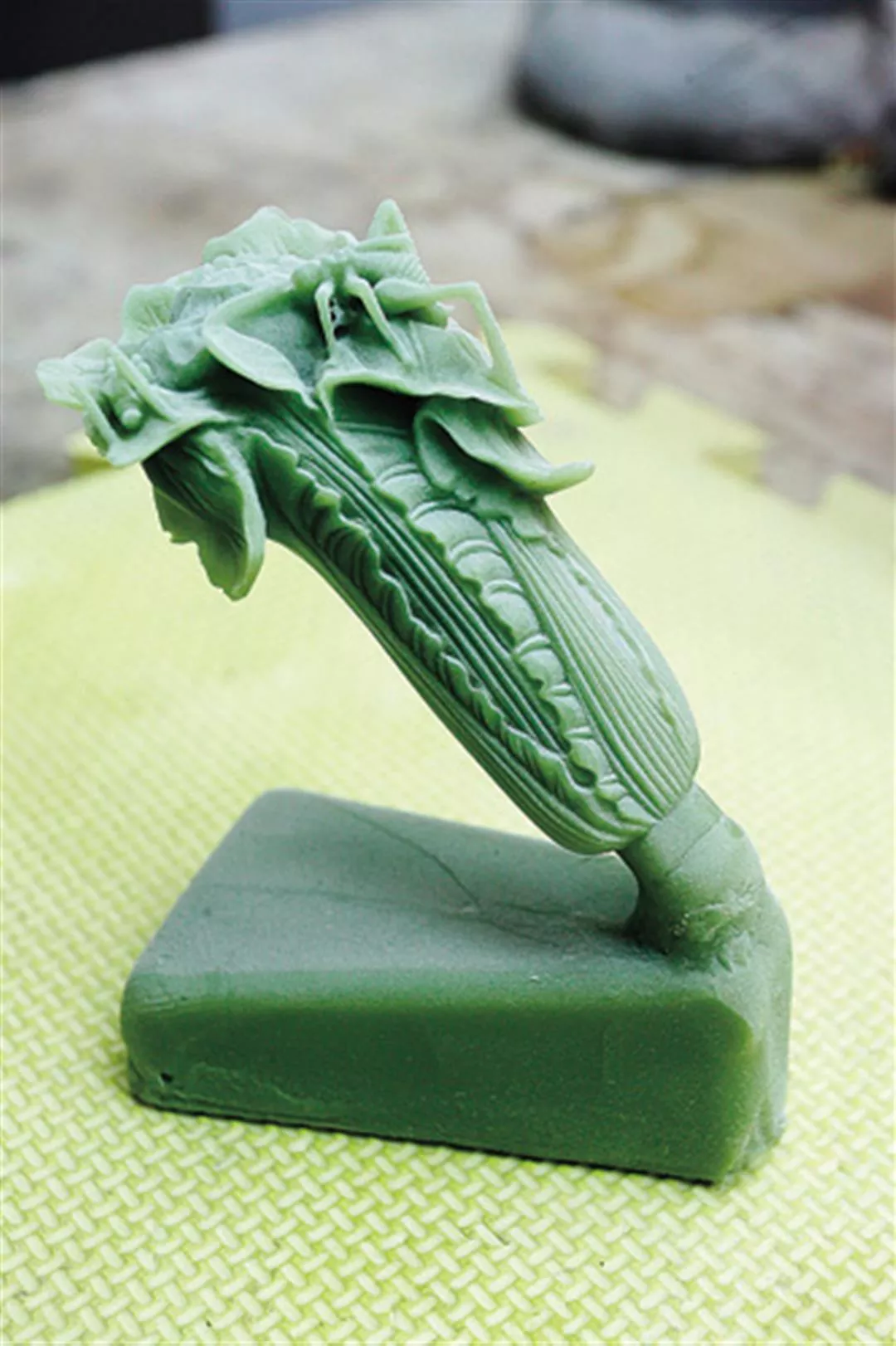 In the final analysis, however, crystal is a type of glass and therefore does not have the feeling of density one finds in jade. Most crystal cabbage knock-offs manage to recreate the shiny brilliance of the original, but fail to capture the white color of the stalks. To further improve his adaptations, Li has begun experimenting with fluoride to emulsify the crystal and create a creamy white color to replace the clear crystal of current products. He hasn't achieved a definitive breakthrough yet, but the testing continues.