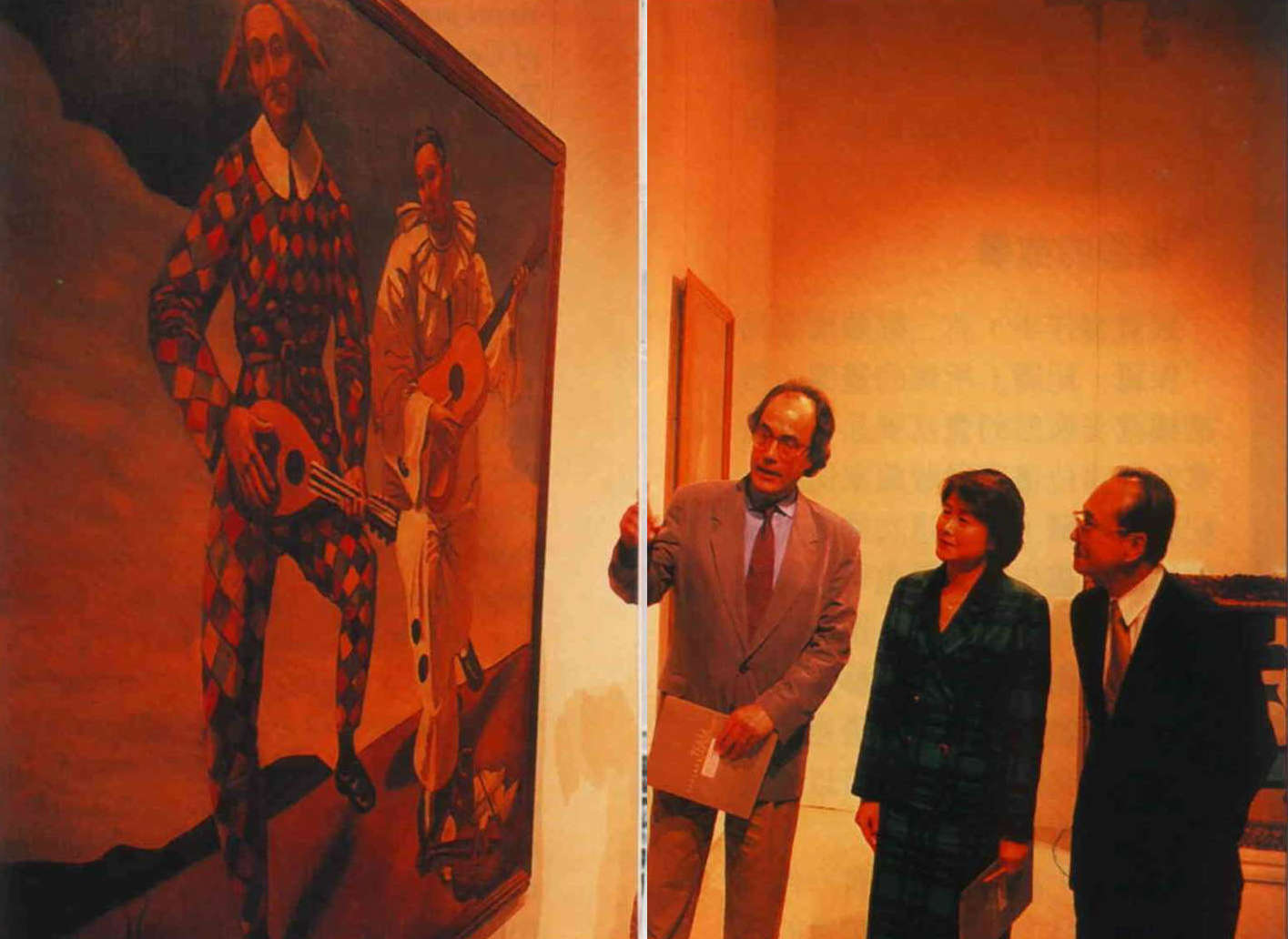 Pierre Georgel, director of the Musee de l'Orangerie in France, Mun-lee Man, director of the Taipei Fine Arts Museum, and Huang Chao-sung, president of the China Times, observe Andre Derain's "Arlequin et Pierrot." Without their efforts, this feast of art would never have come to Taiwan. (photo by Diago Chiu)