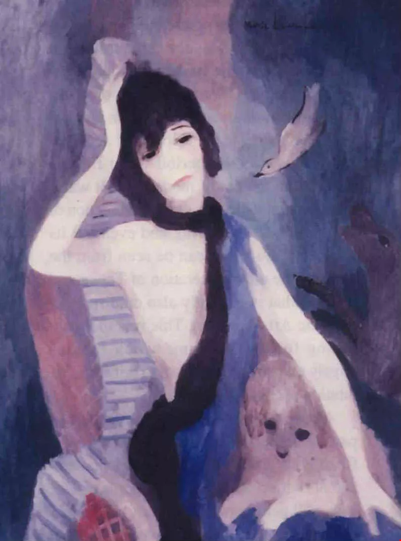 "Portrait de Mademoiselle Chanel" by Marie Laurencin, its subject poetically rendered in pastel shades of pink and blue and given a fairytale setting. Unfortunately, the independent-minded Mademoiselle Chanel, creator of the brand of that name, didn't like the painting at all and refused to accept it. She and the artist fell out as a result.