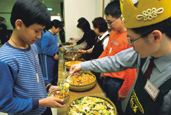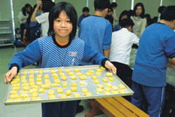 Once they've learned how much has gone into the making of the ingredients, the kids roll up their sleeves and follow the master chef's instructions. First they take dough made of flour, butter, and eggs, and roll out a bunch of round, flat skins. They then wrap up pineapple fillings inside the skins and place them in cake molds shaped like all sorts of cartoon characters, including monkeys, penguins, and koala bears. Amidst the happy sounds of pounding and laughter, the pineapple cakes are completed. Lots of kids make designs of their own, such as smiley faces, whales, persimmons, and baby chicks.
