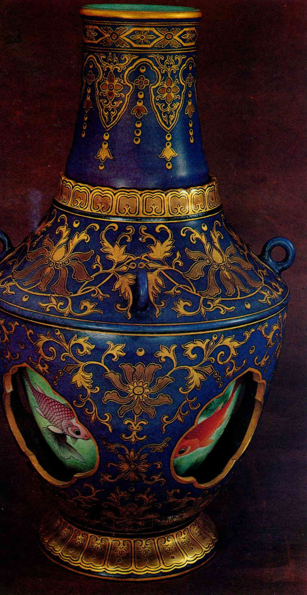 The technique of making porcelain reached its peak in the reign of Emperor Chien Lung (1736-1795) of the Ching dynasty. Pictured here is one of the masterpieces of this dynasty, composed of two vases, one inside the other. The outer vase, covered with blue glaze and decorated with a golden floral pattern, has four flower-shaped openings. The inner vase is tinted green with colored fishes and falling blossoms. When it is rotated, it looks as if the fish are swimming.