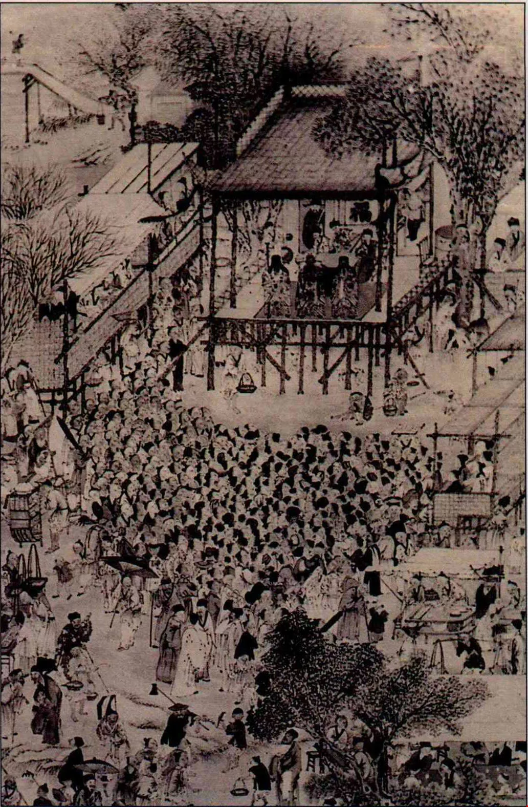 Theater was originally an art form close to people's everyday lives. The engraving A Village Performance shows what it was like to see a play in the Qing dynasty. (Originally from the Nanjing Museum)