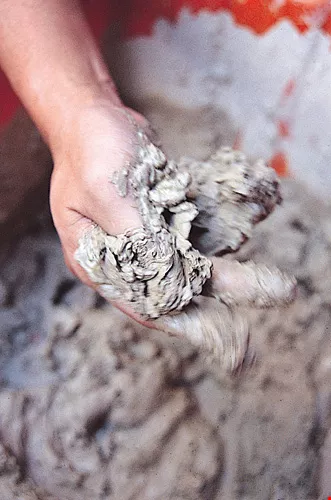 Aged clay is usually cut into blocks for storage, then prior to use is soaked in water. After the clay is fully softened, the extra water is drained off and the clay is stomped on to knead it to an even texture. Before modeling begins, the clay is wedged to prevent deformation or cracking after the body has been formed. Hung points out that good clay is extremely smooth, and feels oily to the touch, which is why it's called "clay oil" in Chinese.