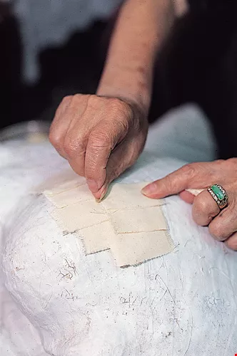 "The bottom and peripheral parts of the lion head are covered with the larger pieces of fabric, but you have to use smaller pieces to get sharp relief for the facial features," explains Hung. "Before using the cheesecloth you have to soak it in water so that the blank won't shrink after coming in contact with the water-based adhesive. Only after it's been soaked and dried can you tear it into small pieces."