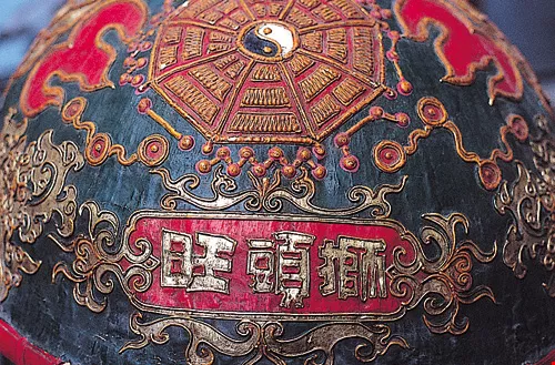 Each symbol has its meaning. The flames represent the lion's imposing power and unbridled yang essence. They show that the lion is a banisher of malevolence. The bagua grid, Yin-Yang symbol, and Big Dipper all advertise the lion's ability to ward off evil and protect the home. A mirror mounted over the flames represents the five-colored mirror that shows the "true colors," good or evil, of whoever looks into it.