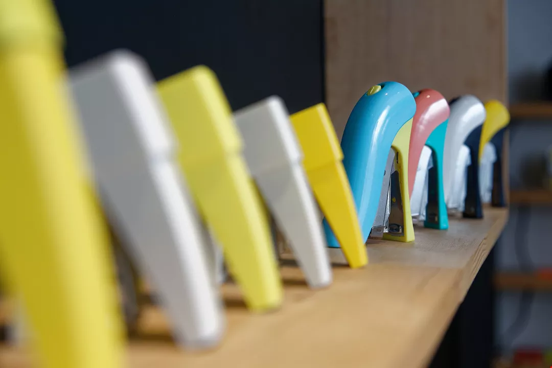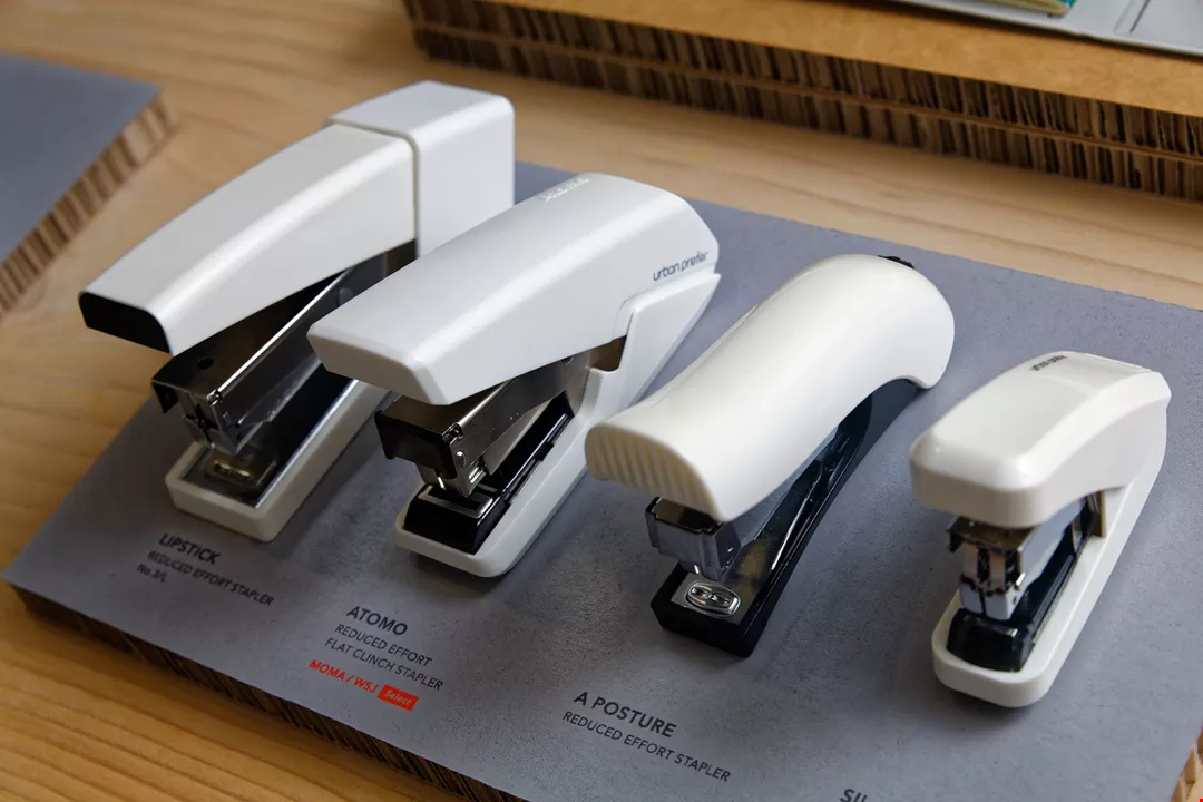 The “easy” staplers it introduced in 2014, for example, use a double-lever design that requires less effort to operate than any other stapler currently on the market. They also feature a staple drawer that opens easily with a quick press on the end of the device. The “easy” line currently consists of four models, including one that looks like a high-heeled shoe, another with an extra-large staple drawer, and still another designed with European and North American standards in mind. One of the models, a flat stapler called Atomo, is now available in the gift shop of New York City’s Museum of Modern Art.