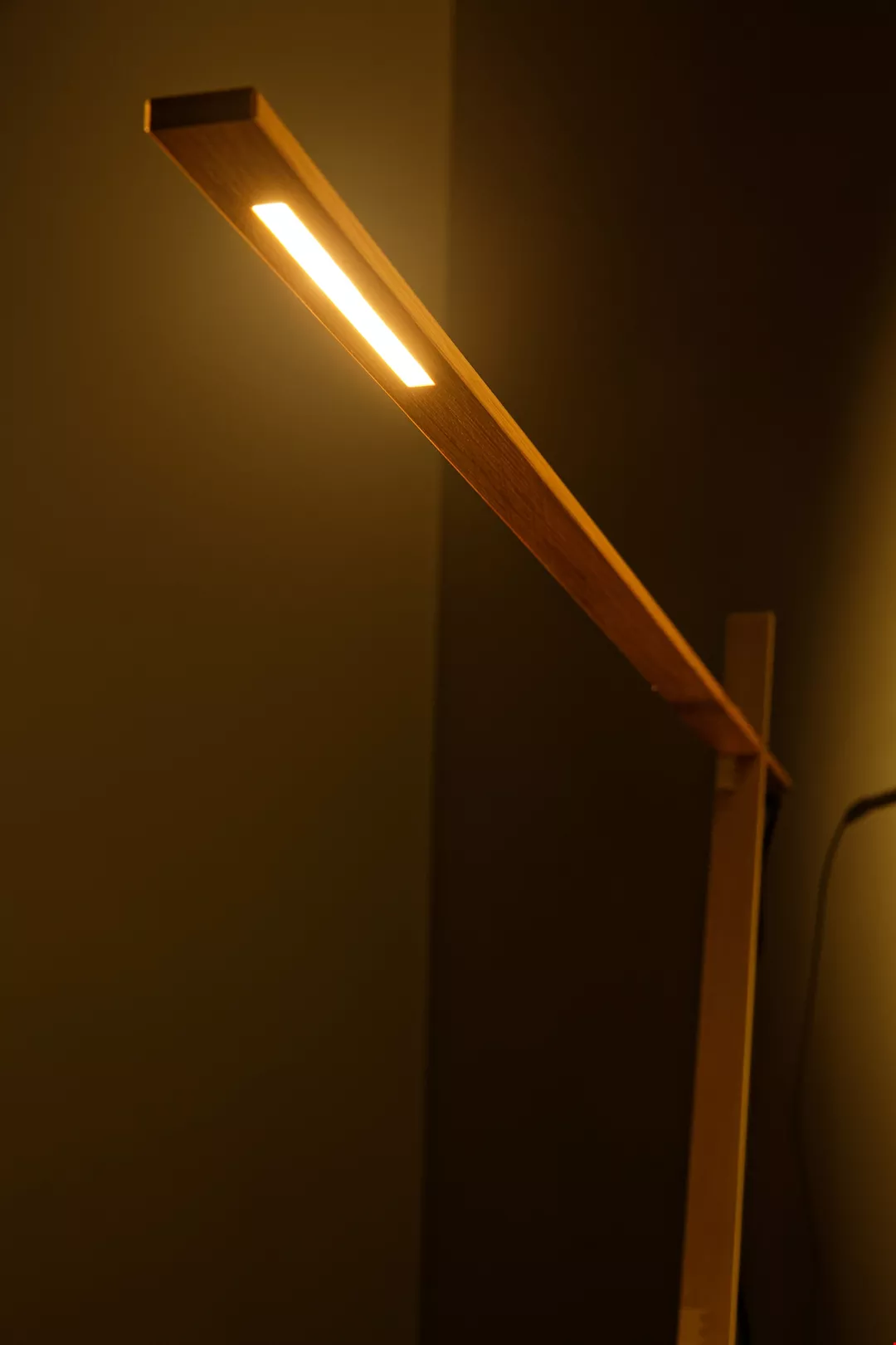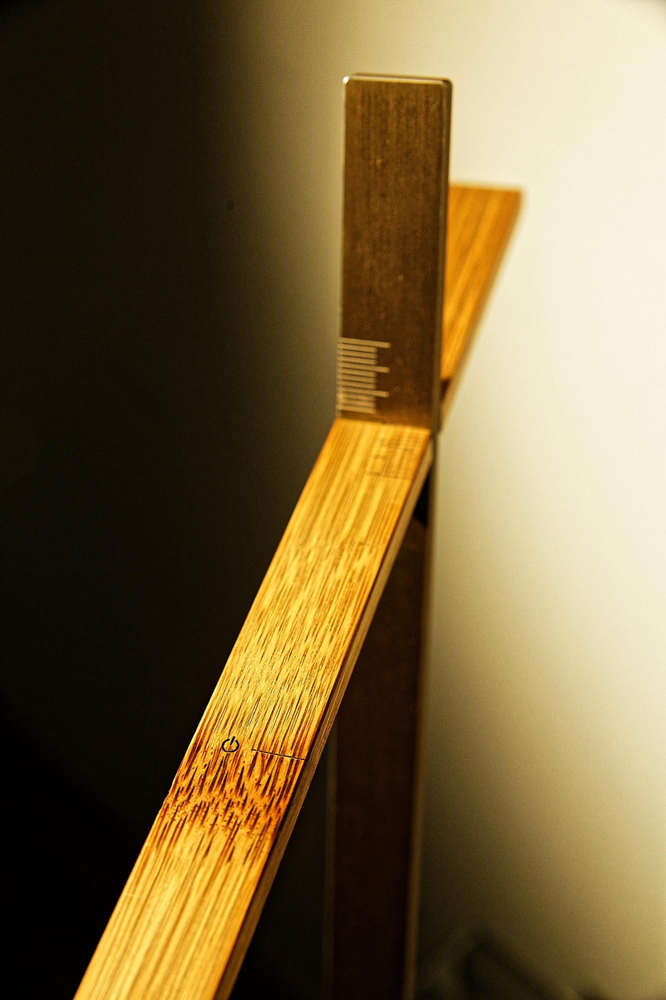 The power switch of Pegacasa’s LED desk lamp is located in the node of its ma bamboo arm. Made from natural materials, each lamp is unique.