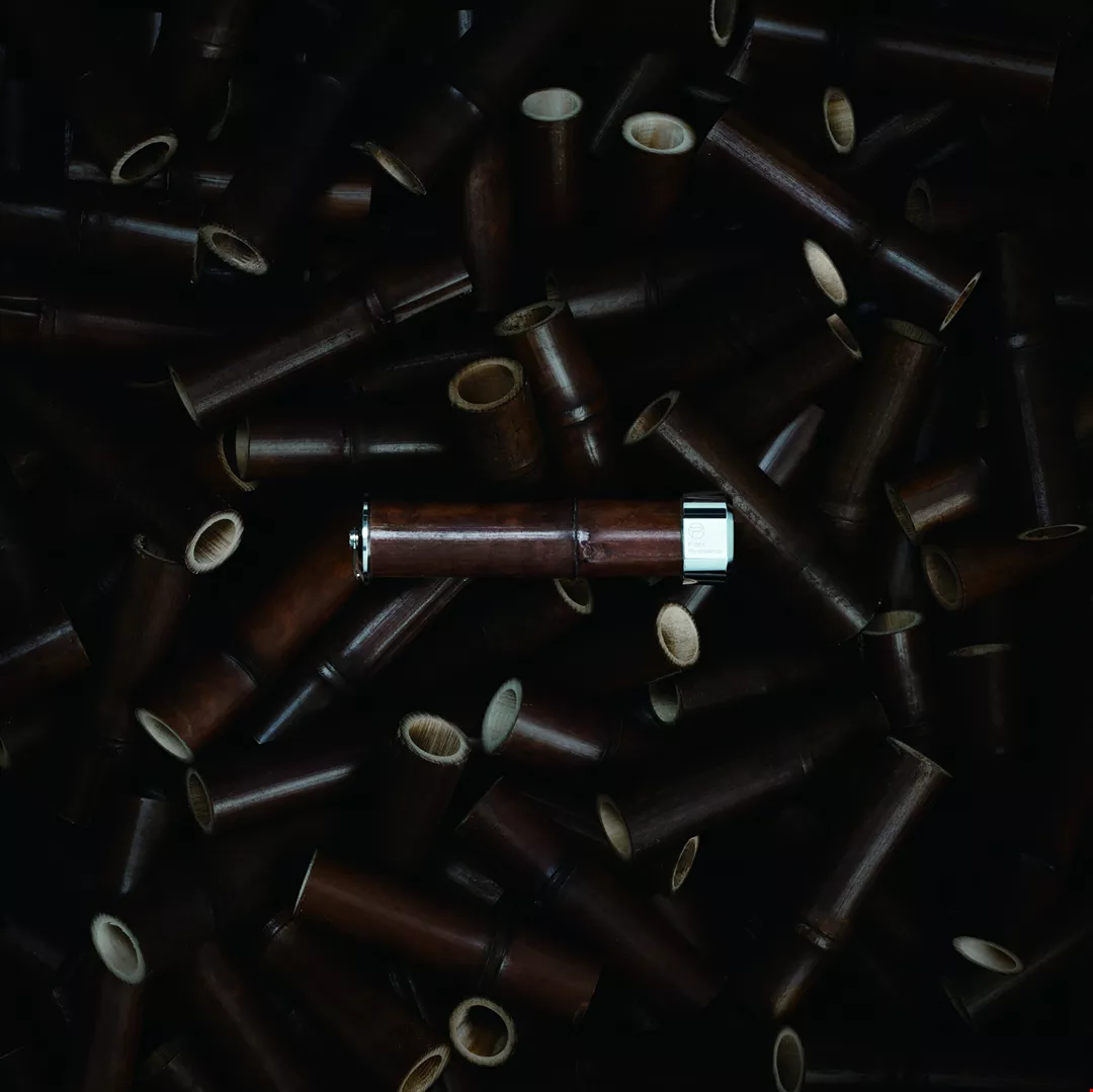 The brand’s “Torch” flashlight is another trademark piece. The flashlight’s moso bamboo body is carbonized, colored, and dried; the contacts in its battery compartment are plated with gold; its beam can illuminate objects six stories up; and it features a switch with a finely crafted rotating lever.