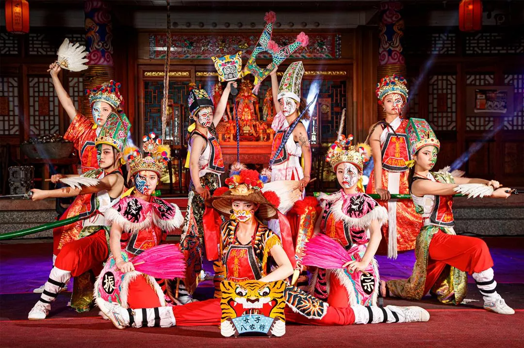 The troupe members who play the Eight Women Generals are all university-trained dancers. Their performance preserves the traditional role of the Eight Generals and their Five Elements and Eight Trigrams path-clearing formations, while incorporating dance and martial arts movements to give a sense of gentleness combined with strength. Eight Generals processions are traditionally accompanied by the sounds of wooden clappers, gongs, and drums. However, the Eight Women Generals use a rock-and-roll-style soundtrack from Huang Chun-hsiung’s puppet theater TV shows to add impact to their performances.