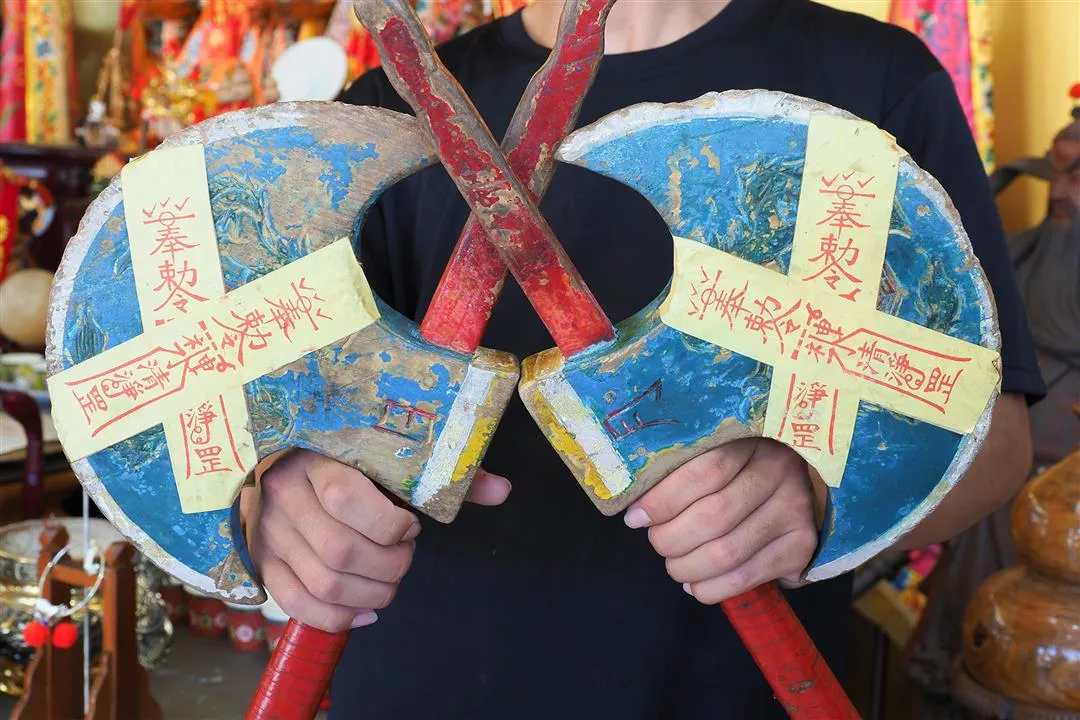 The Song Jiang Battle Array is based on the novel The Water Margin. The photo shows the two axes wielded by Li Kui, the Black Whirlwind.