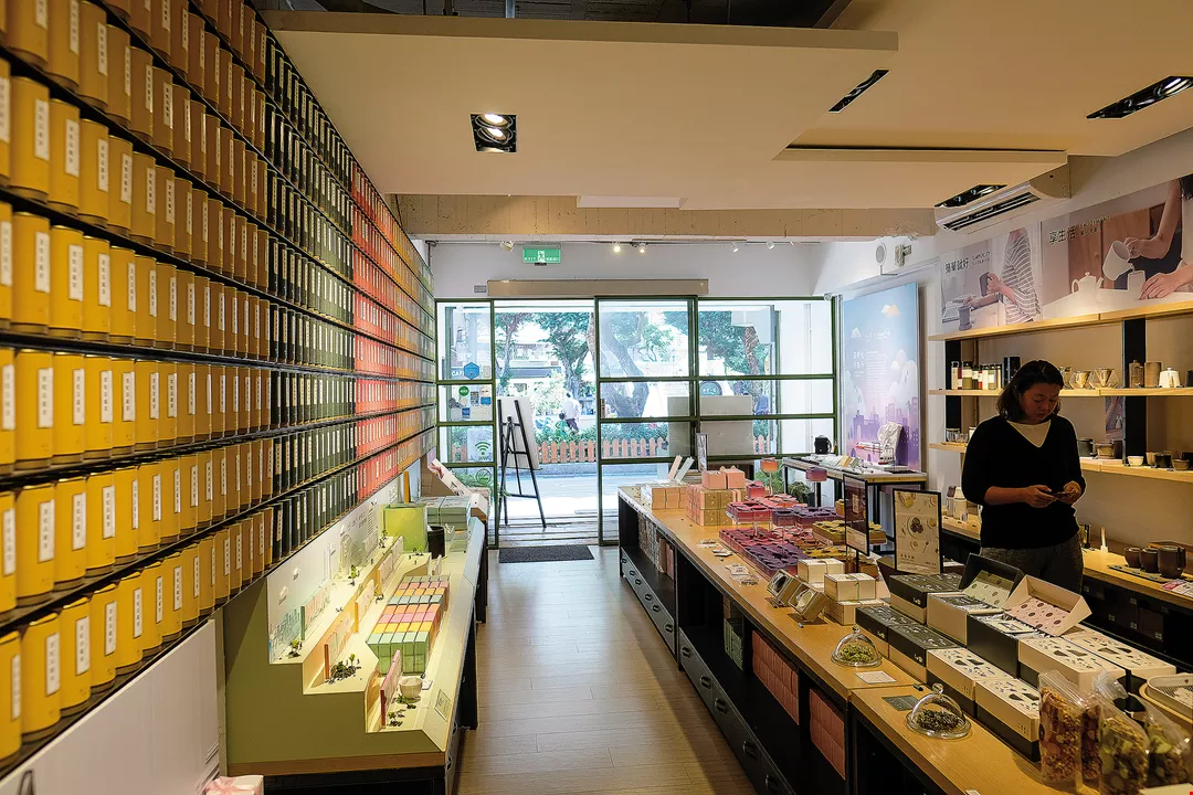 Looking in, one is struck by the colorful jars full of tea that line the shelves on the back wall—rouge ones that hold fully fermented teas like regular black tea and tieguanyin, light yellow ones with semi-fermented teas like oolong, and cyan ones with unfermented teas like biluochun and baozhong. Dozens of varieties of tea are available, sketching out a map of Taiwan’s tea terrain to delightfully tempt travelers.