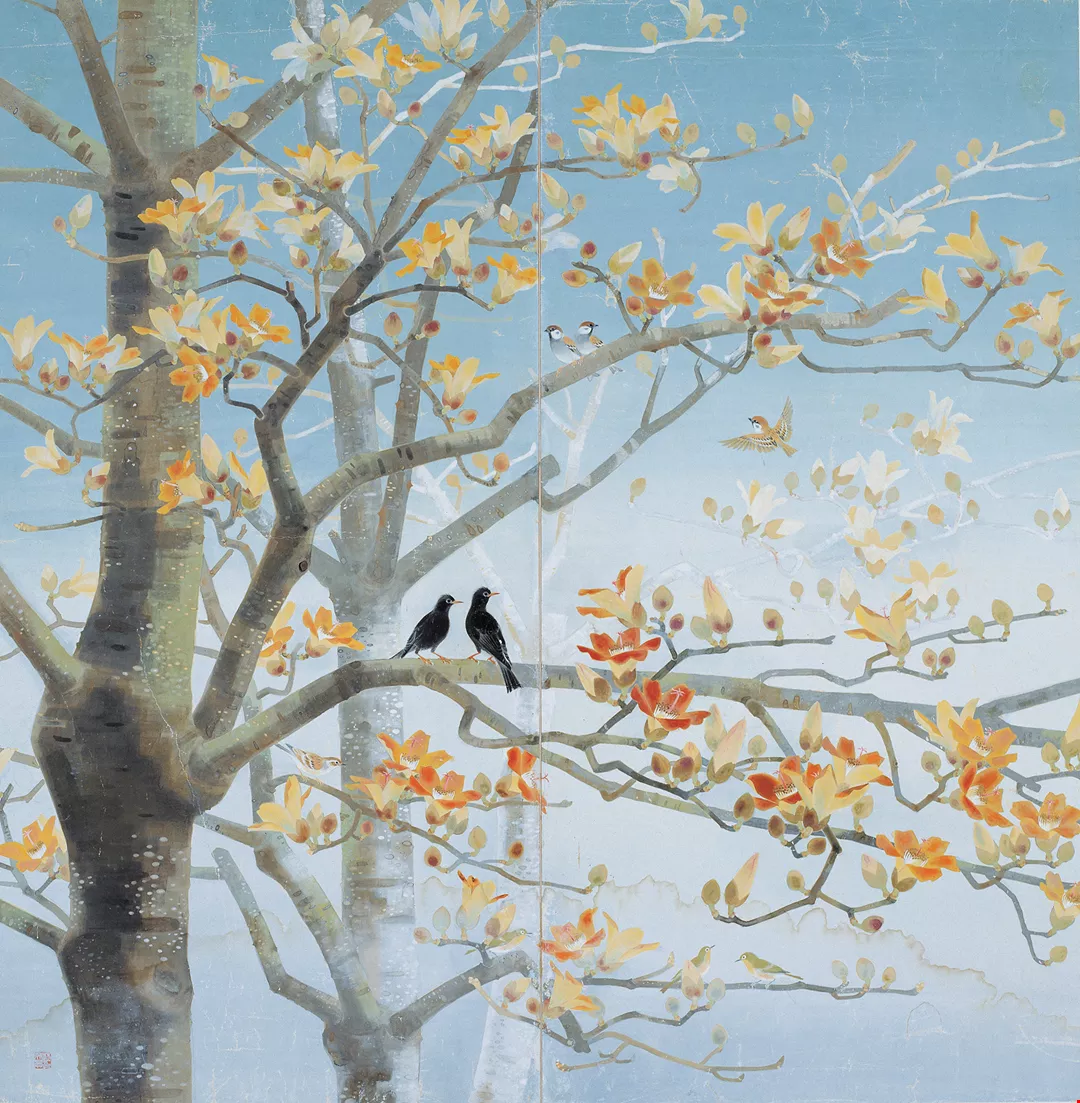Lin Yushan’s Spring in Formosa depicts cotton trees in bloom. A pair of black bulbuls perch on a branch in the foreground, two warbling white-eyes are below, and there are also a few sparrows, breathing life into this spring scene.