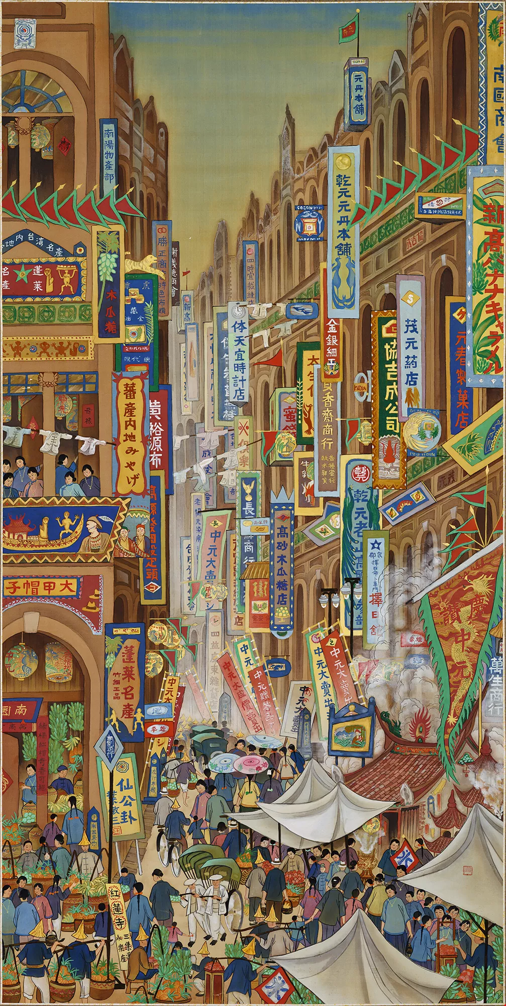 Kuo Hsueh-hu’s Festival on South Street portrays the hustle and bustle of Taipei’s Dadaocheng during the annual Ghost Festival. (collection of the Taipei Fine Arts Museum, by permission of Kuo Hsueh-hu Foundation)