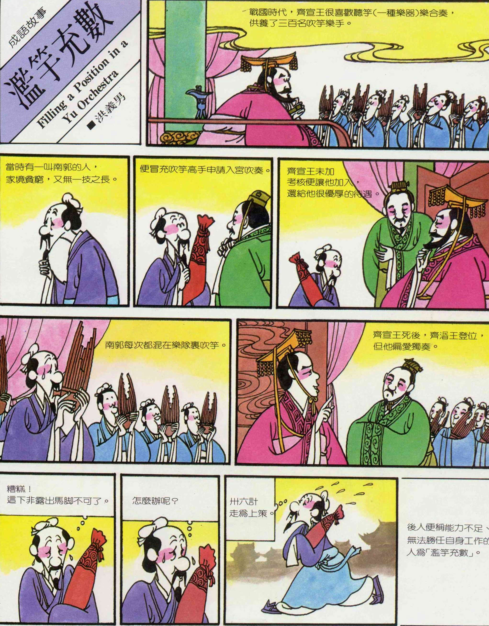 During the Warring States Period the king of Ch'i loved to hear the music of a reed instrument called the Yu played in concert, and hired a palace orchestra of 300 Yu musicians. At that time there lived a man named Nankuo, who lacked both money and talent. Posing as a musician, he applied for a position in the palace orchestra. Unawares, the king hired the imposter and provided him with a generous salary. Nankuo remained undiscovered among the large group of musicians.