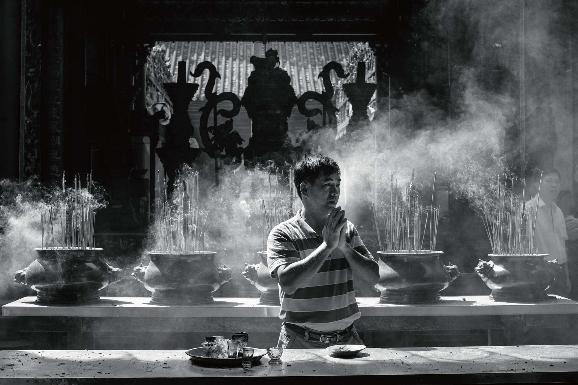 A praying man surrounded by clouds of incense smoke shows just how similar Taiwanese and Vietnamese culture can be.
