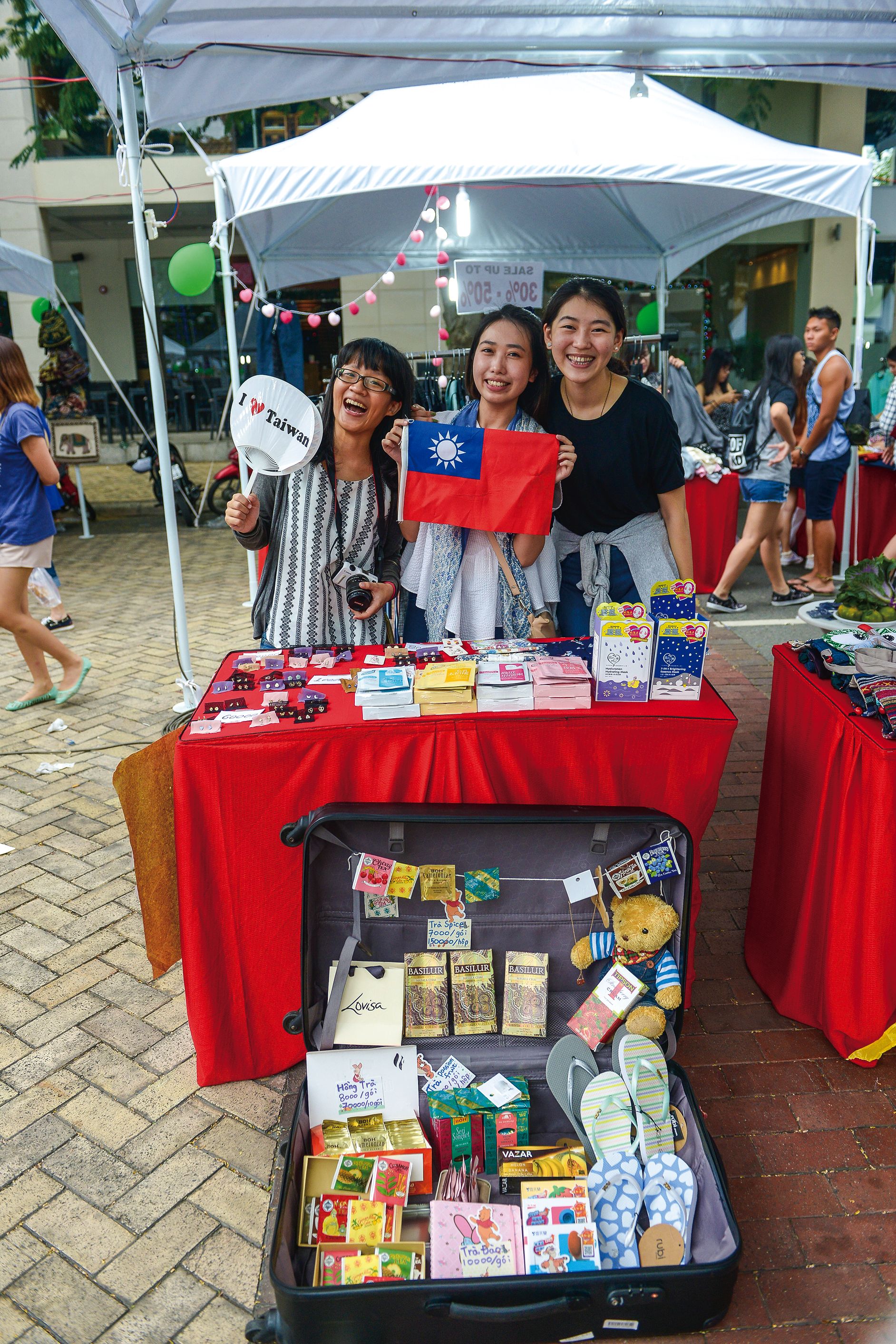 Mandarin teachers from Taiwan selling a variety of small items in a Vietnamese flea market always remember their duty to promote Taiwanese culture.