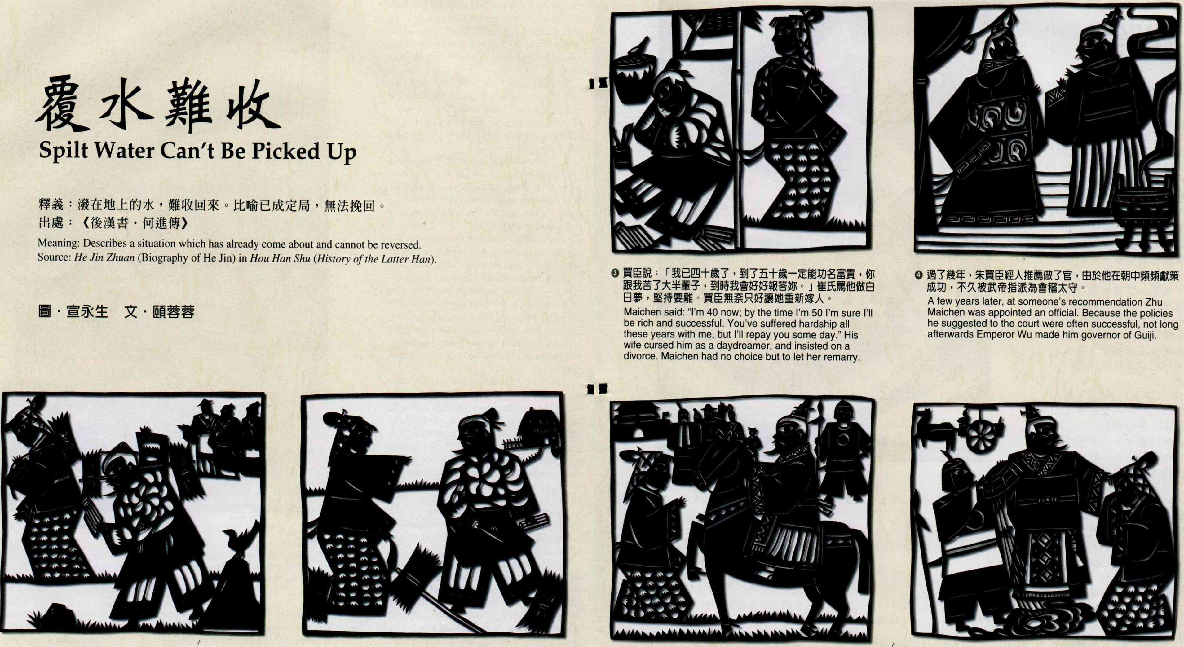 6.With a cold laugh, Maichen said: "Back then, nothing I could say would make you stay, and you mocked me as a daydreamer. Well now..." He ordered one of his guards to fetch water and spill it on the ground. Then he told his ex-wife that if she could collect up the water and put it back in the bowl, they could be reunited. His wife was so ashamed that she didn't even dare raise her head, and Zhu Maichen gave his horse a lash of the whip and rode on.