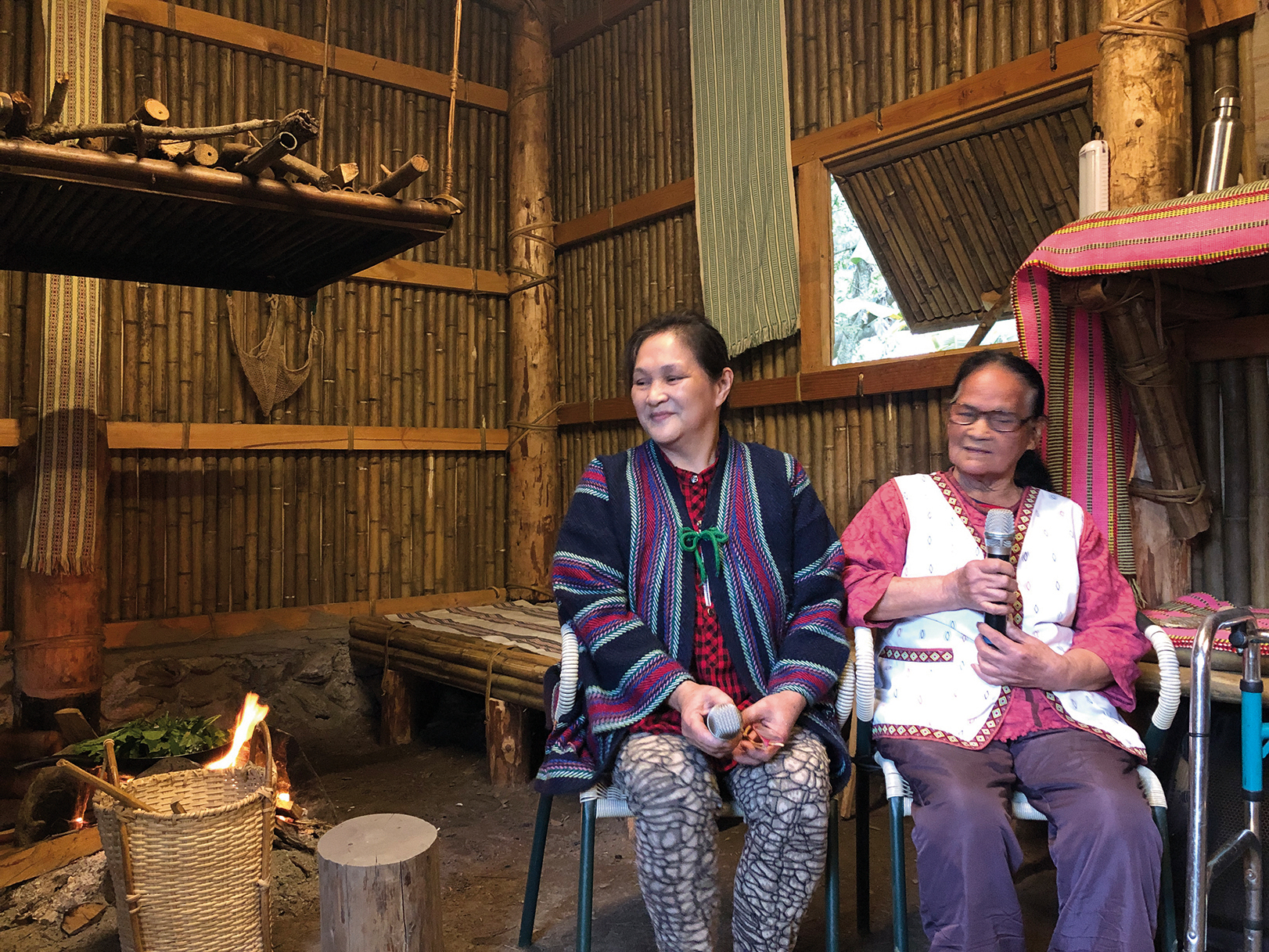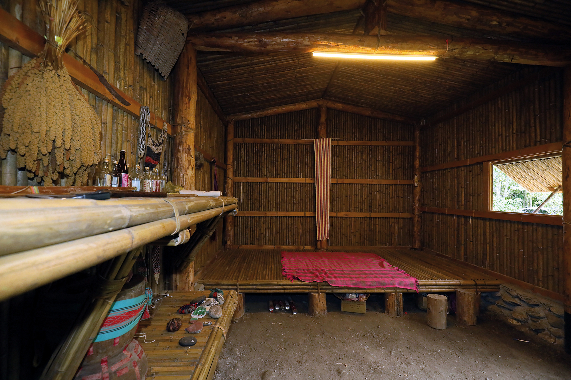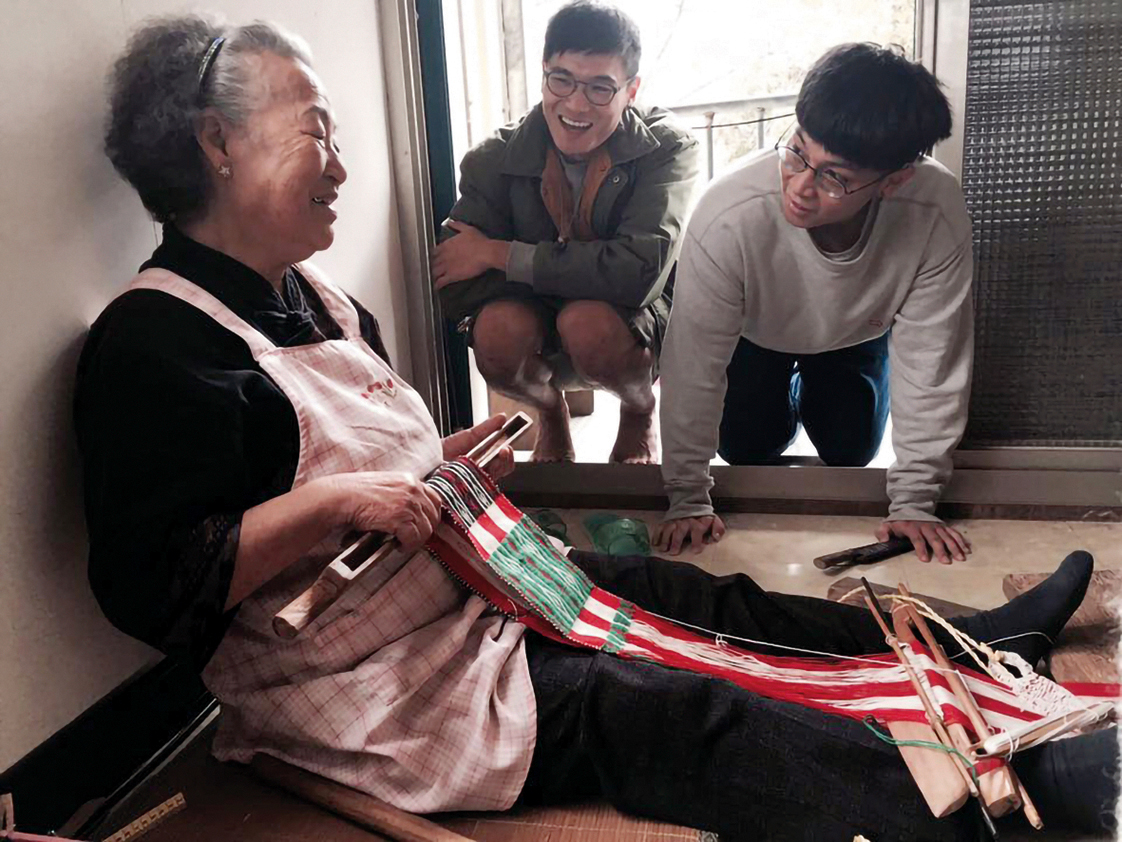 Since the completion of their building project in October 2019, Elug has organized workshops on rattan weaving and bow loom weaving in their traditional house. There, experienced villagers teach participants how to prepare yellow rattan palm canes and use them to make racks for draining dishes, drying cloth, or displaying decorative objects. In this way, the ancestral skills of the Truku people can be kept alive. The bow loom weaving workshops take place in the winter. A fire is built inside the house. The attendees are taught to bend bamboo stems into a bow shape to hold warp threads in tension. On these bow looms, they set about weaving colorful bands of cloth. The whole setting—the weaving and the studious looks—seem to belong to a bygone age. It feels as if the house has come to life.
