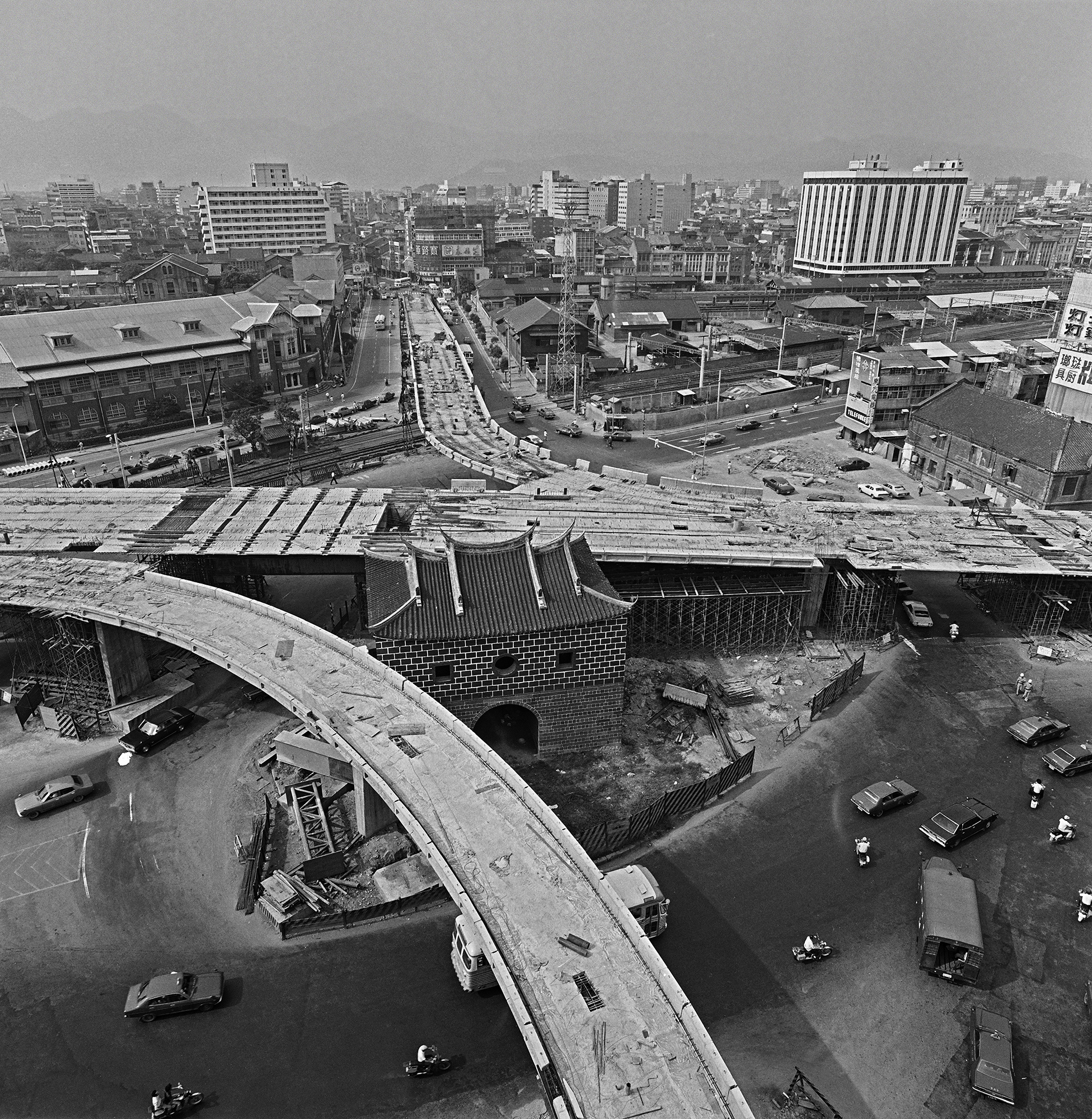 In the Qing Dynasty, Taipei’s North Gate was a major access point between the walled city and Dadaocheng. However, it was overshadowed in the late 1970s by the newly built Beimen Elevated Highway and one of its offramps, and only saw the sun and sky again in 2016. The photo shows the North Gate during construction of the elevated highway. (MOFA file photo)