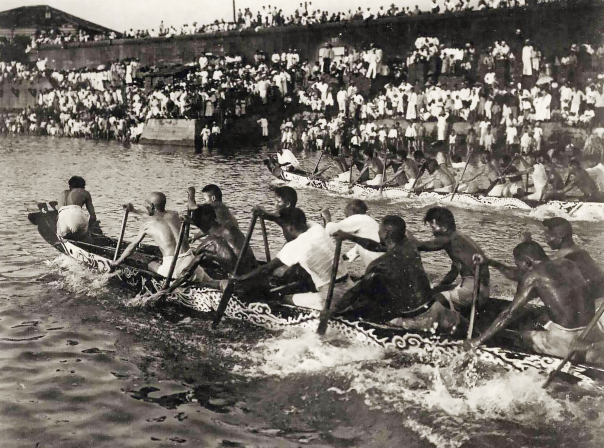 Institutions such as libraries that hold historical materials are working with firms that have the requisite technology to create databases for digital collections. The photo shows a boat race at Dragon Boat Festival during Japanese rule. (courtesy of TBMC)