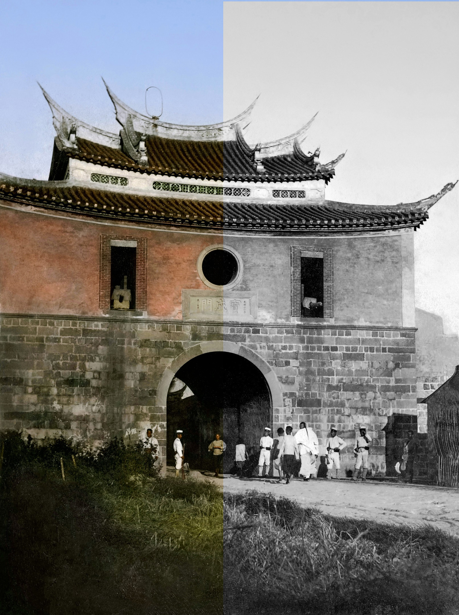 This photo, originally in black and white, shows Taipei’s West Gate in the early period of Japanese rule. Here, the left-hand part has been colorized, making the image more vivid and appealing. (courtesy of GJ Taiwan)