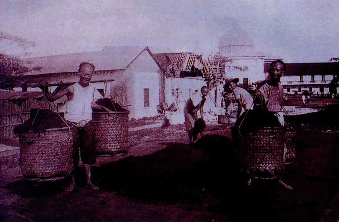 Baskets of coal borne through the city on shoulder poles. Chinese immigrants were expelled and massacred six times under the Spanish colonial government, but they continued slaving away in the Philippines in pursuit of a better life. (courtesy of Li Hsiu-chin)