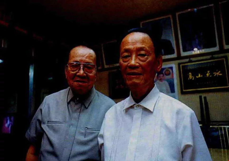 Hong Liren (right), Who has been with the Koc Hong Cultural Association for nearly 60 years, proudly claims to be well-known throughout the world of nanguan music. To the left is the Association's incoming chairman, Wu Wenxiang.